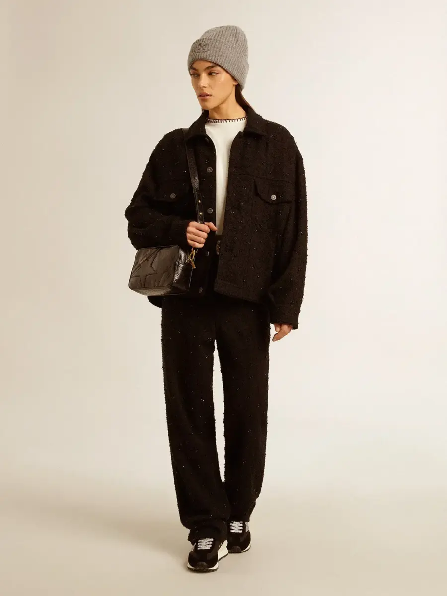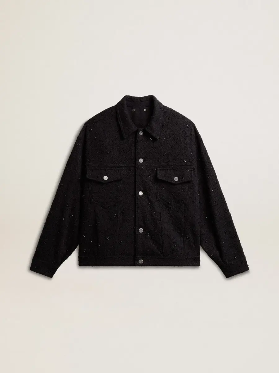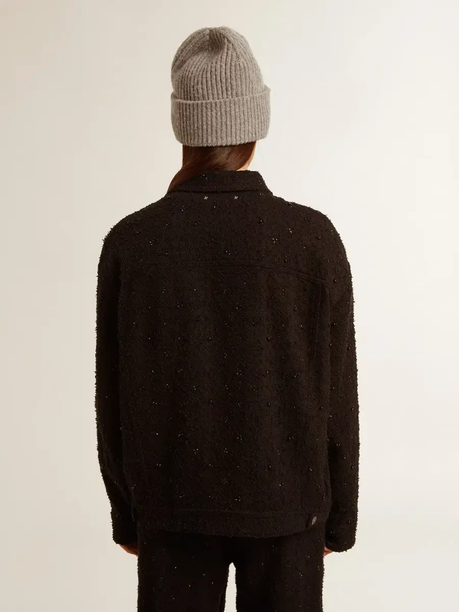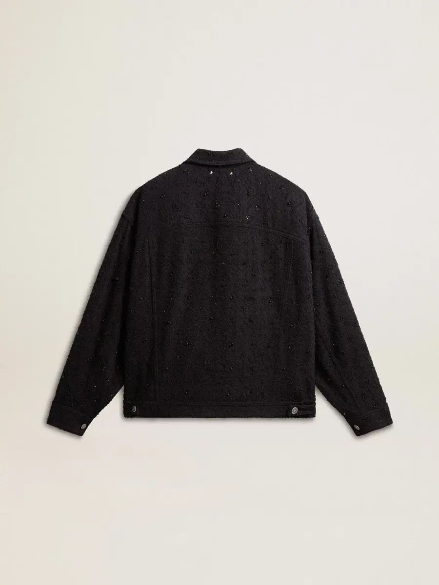 Una historia de amor con nuestra ciudad natal, Marghera. Donde todo comenzó. Nuestra última colección refleja el espíritu de nuestro lugar de origen, sus contrastes, su alma industrial y sus paisajes manufactureros, entrelazando inspiraciones tanto de la vibrante energía de la ropa de trabajo como de la refinada esencia de la sastrería tradicional. Confeccionada en denim de algodón bouclé negro, esta chaqueta para mujer presenta bordados láser y cristales y perlas a juego de diferentes tamaños. Los dos bolsillos con cierre de botón en la parte delantera añaden el toque final.