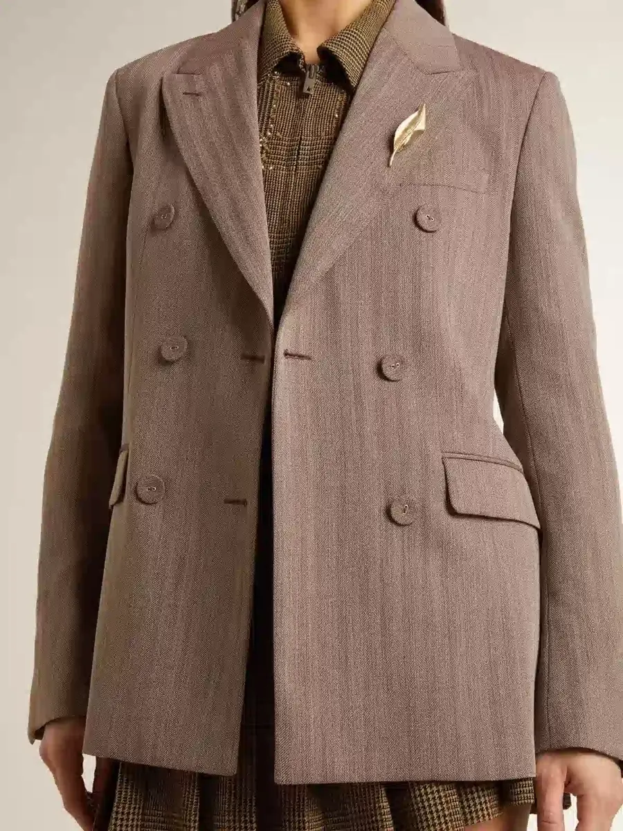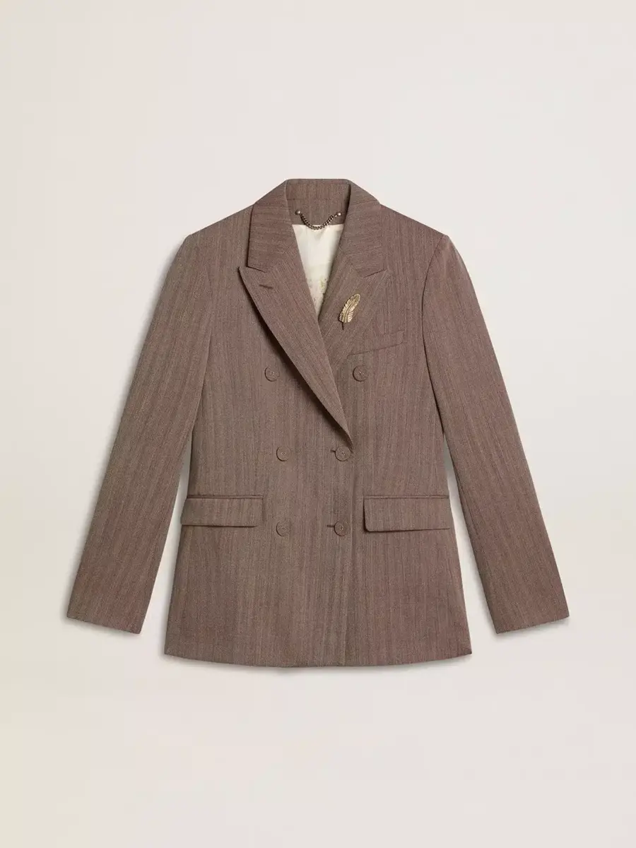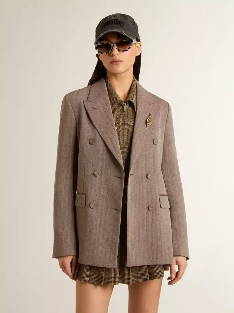 Blazer cruzado de mujer en mezcla de lana beige con diseño chevron