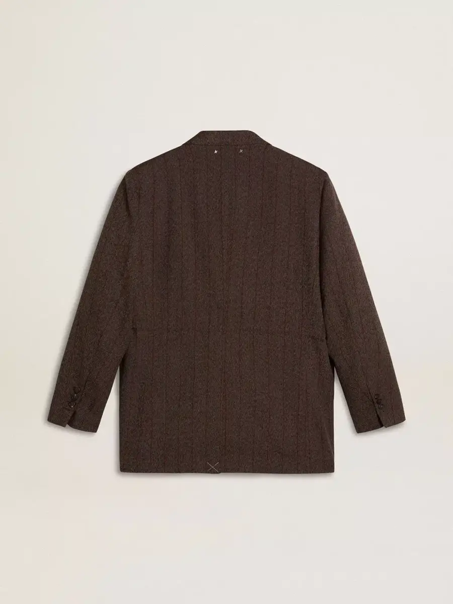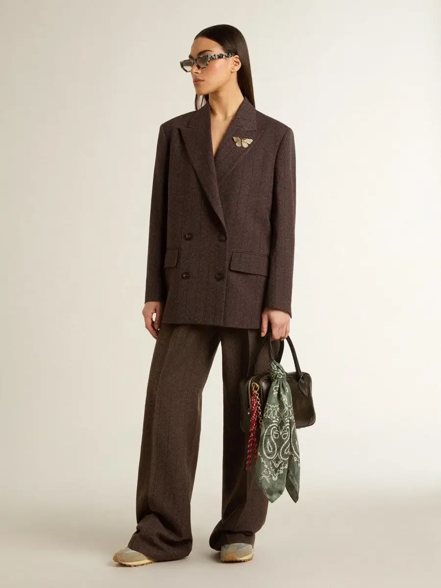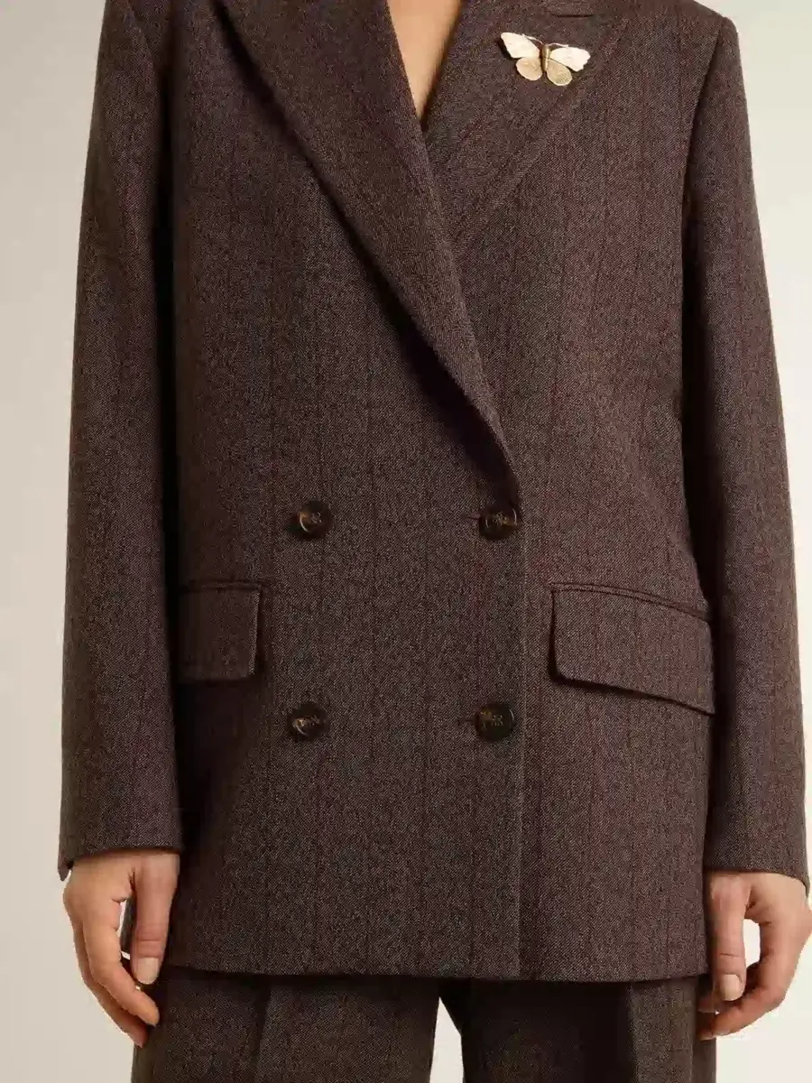 La segunda entrega de la colección Otoño/Invierno 25 se desarrolla como un viaje relajado y refrescante, entretejido en el tejido de cada una de las prendas. Esta chaqueta cruzada de mujer en lana marrón oscuro presenta un diseño de rayas verticales finas. Dos bolsillos delanteros y un cierre de cuatro botones le dan el toque final.