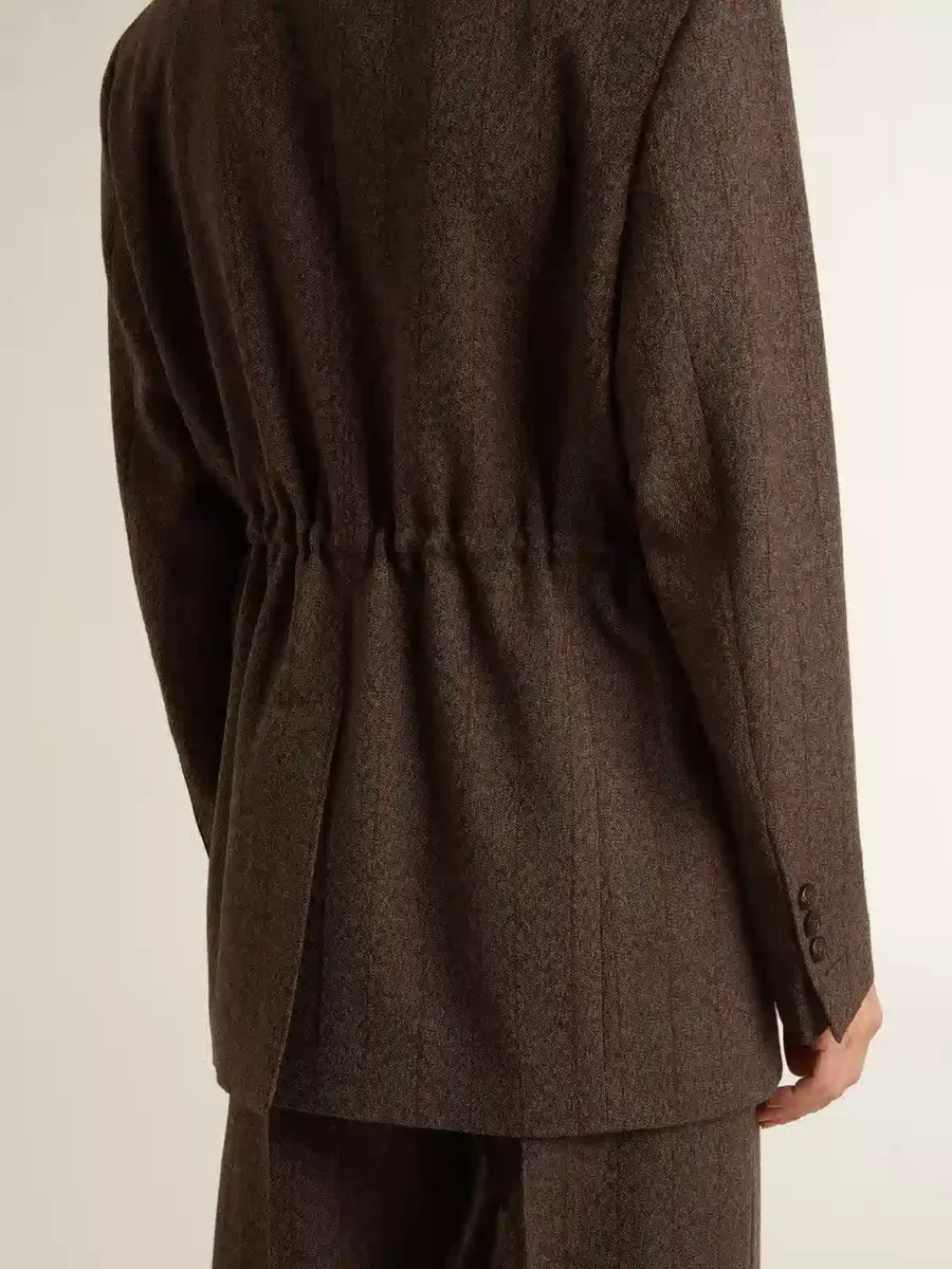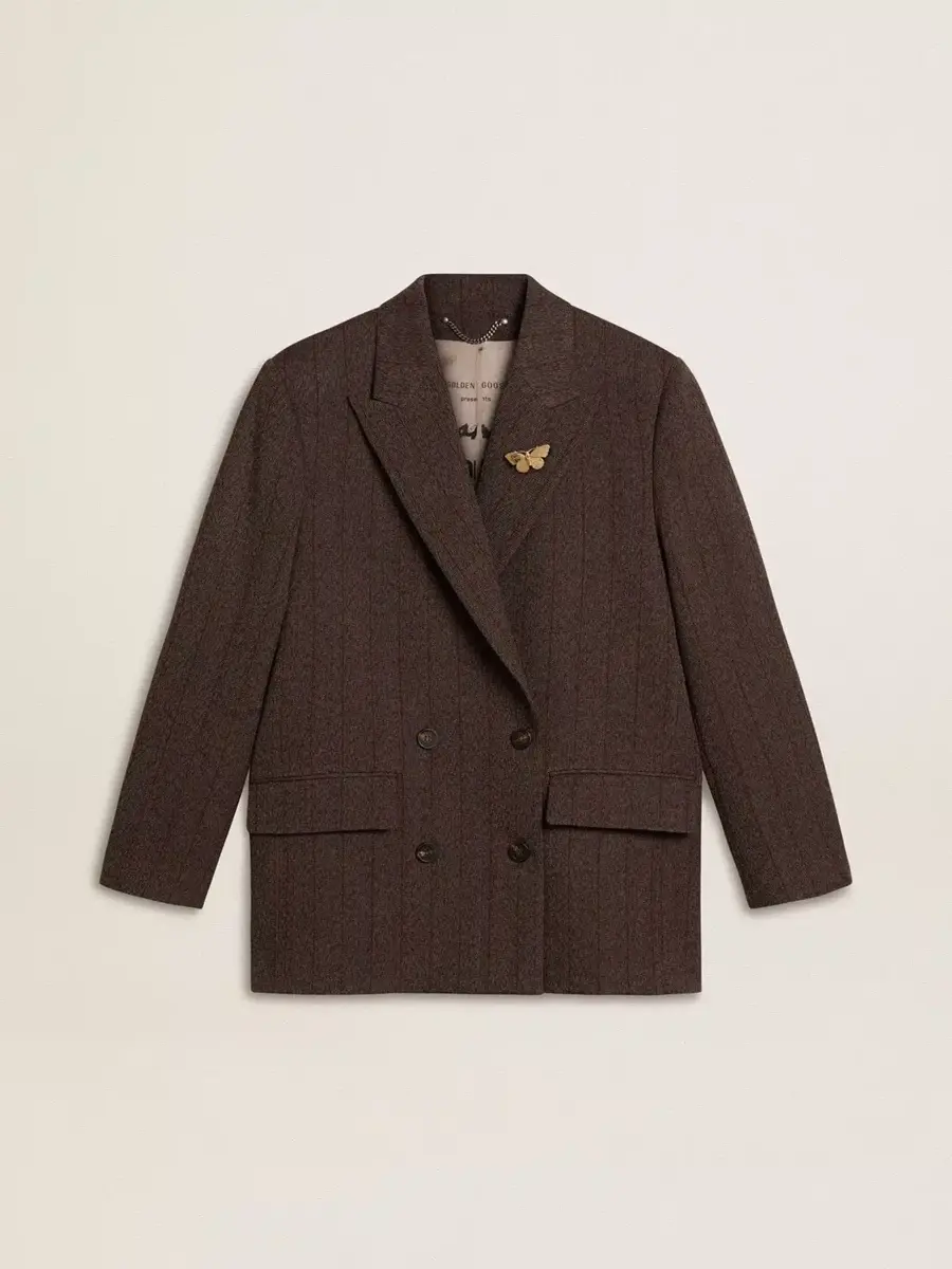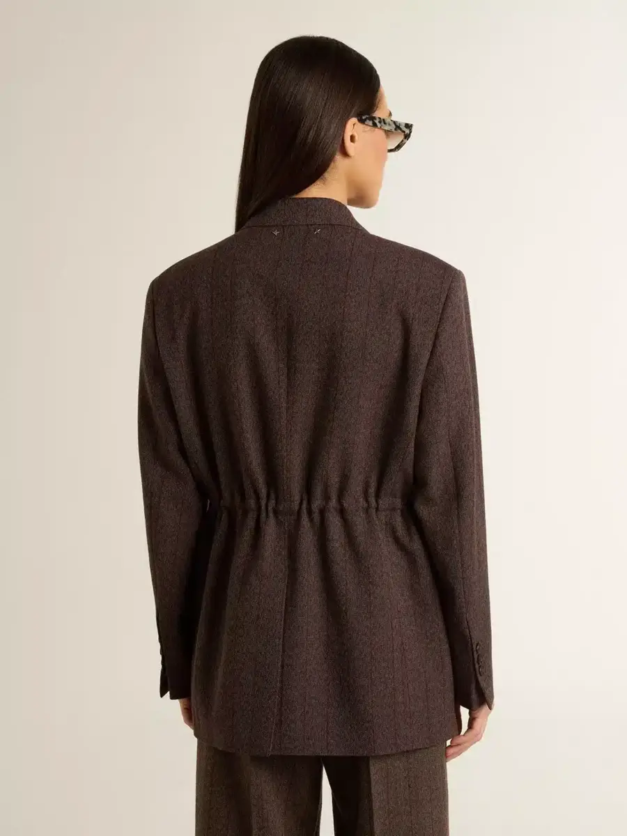 La segunda entrega de la colección Otoño/Invierno 25 se desarrolla como un viaje relajado y refrescante, entretejido en el tejido de cada una de las prendas. Esta chaqueta cruzada de mujer en lana marrón oscuro presenta un diseño de rayas verticales finas. Dos bolsillos delanteros y un cierre de cuatro botones le dan el toque final.