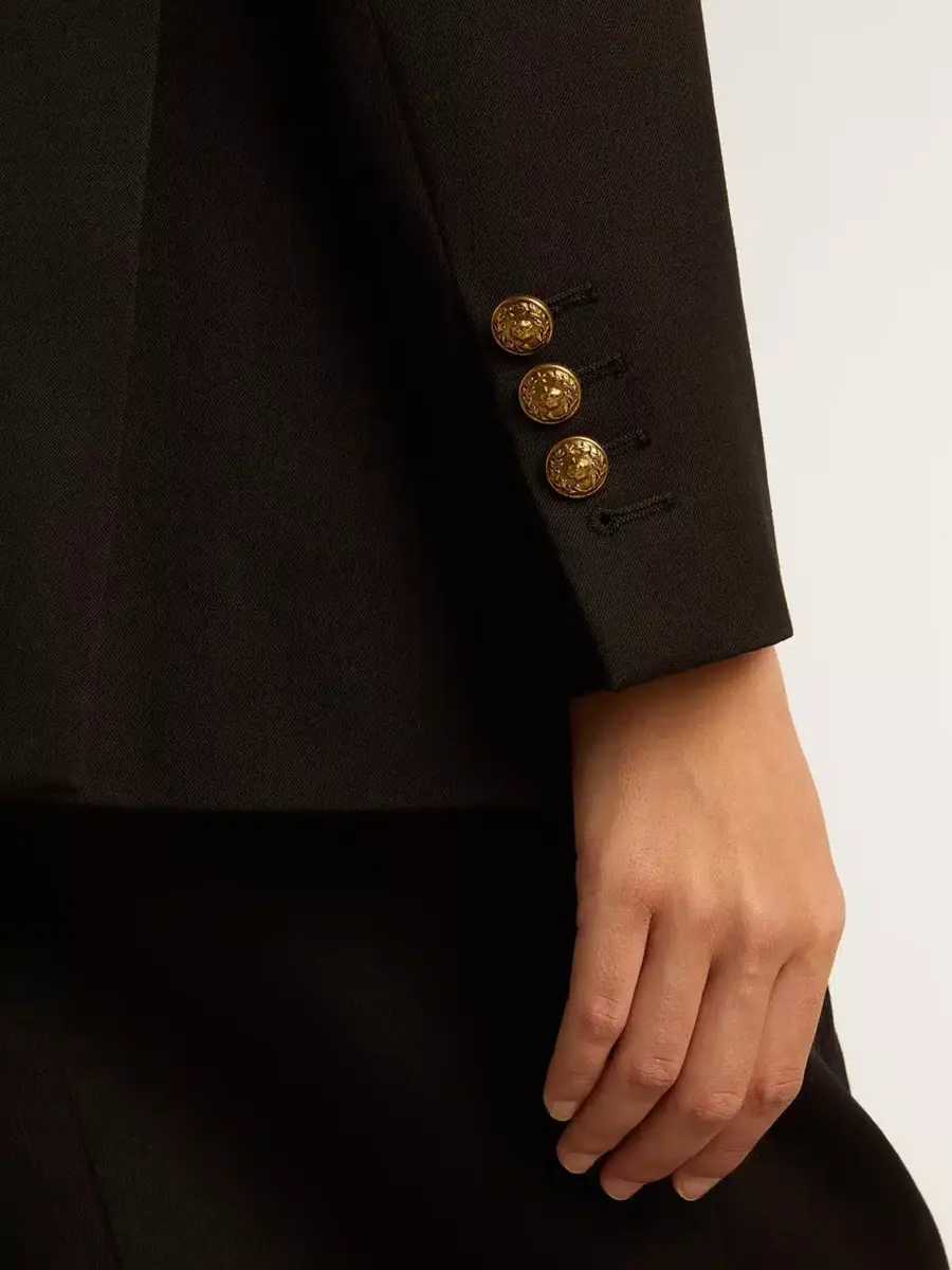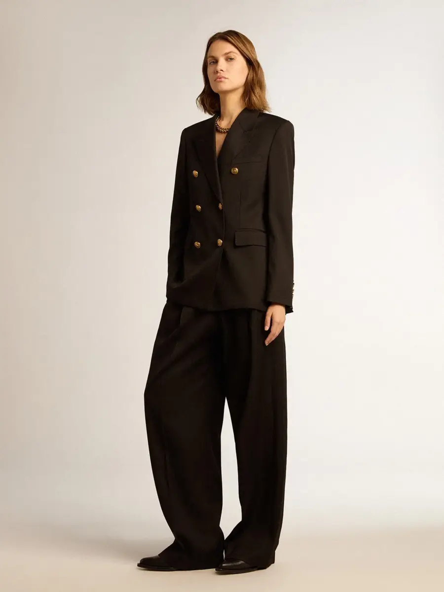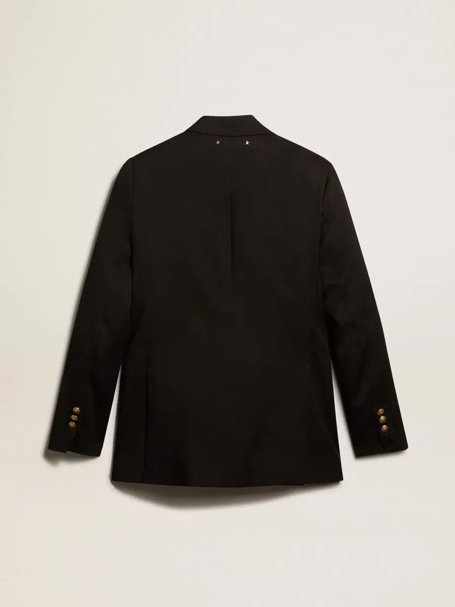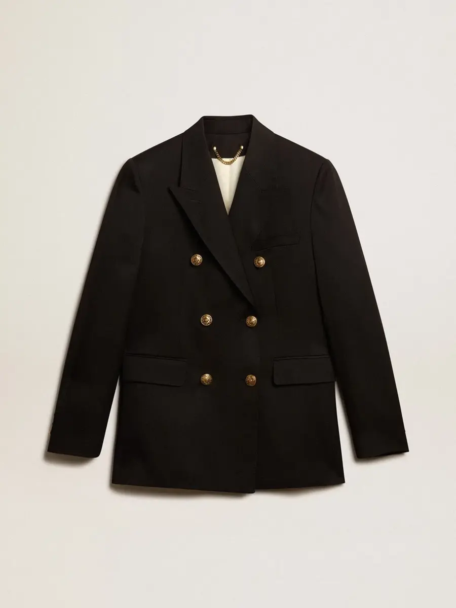 Una colección única y atemporal que encapsula el ADN de Golden Goose, diseñada para acompañarte cada día, en las buenas y en las malas, llueva o haga sol. Esta chaqueta cruzada de corte recto para mujer, confeccionada en gabardina de lana negra, cuenta con un cierre con botones heráldicos dorados.