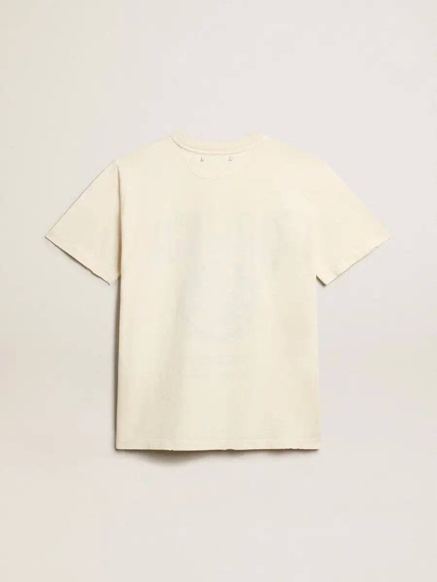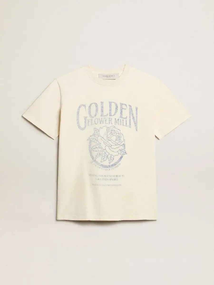 Desde Venecia, nuestro hogar, hasta París, nuestro sueño. La colección Journey captura la esencia y la belleza de los momentos cotidianos en la Ciudad de la Luz, inmersa en una atmósfera hipnótica donde la intimidad, la autenticidad y la curiosidad son el alma palpitante de la misma. Confeccionada en jersey de algodón blanco envejecido, esta camiseta de mujer presenta el logotipo descolorido de Golden Flower Mill y un estampado en la parte delantera. Las zonas desgastadas a mano en los bordes añaden el toque final, haciendo que esta prenda sea única.