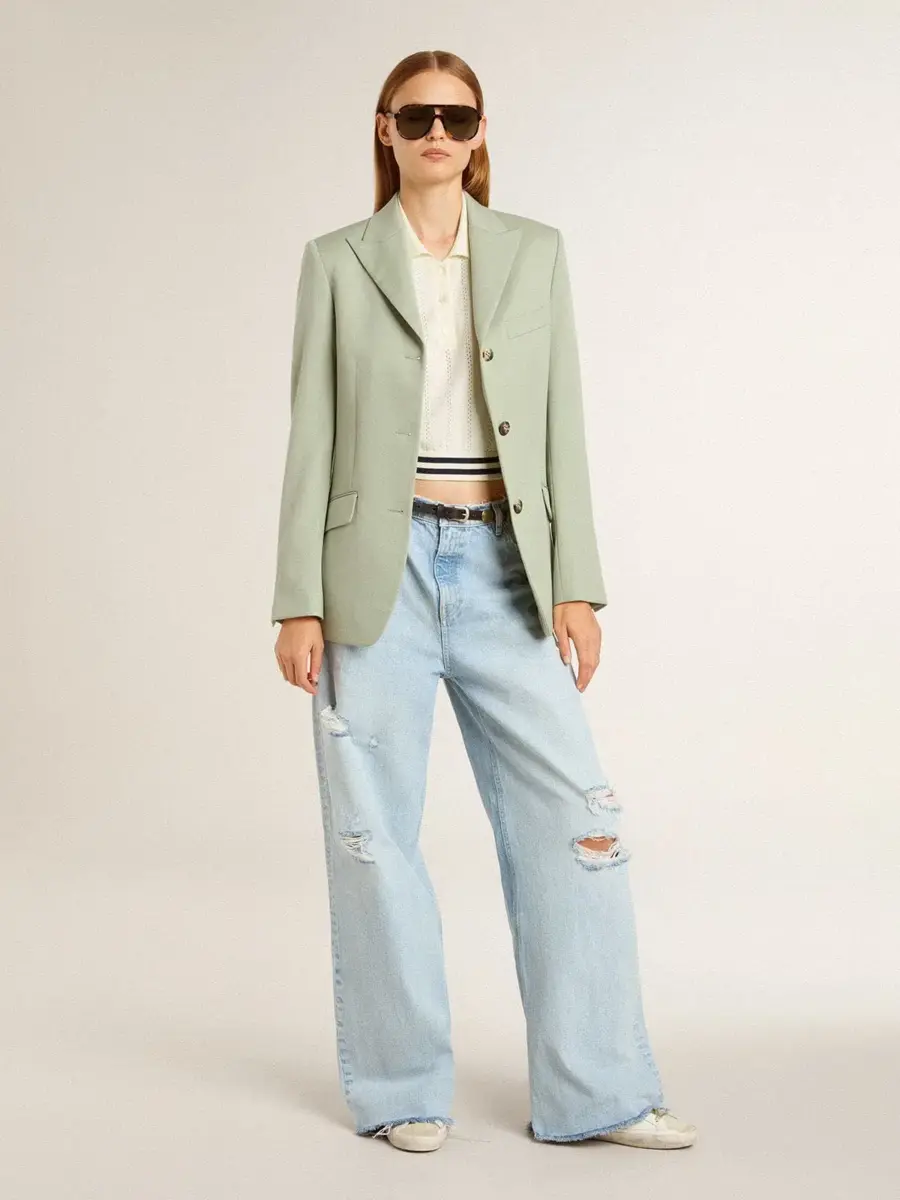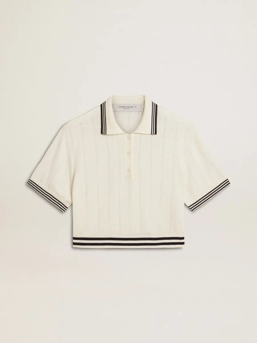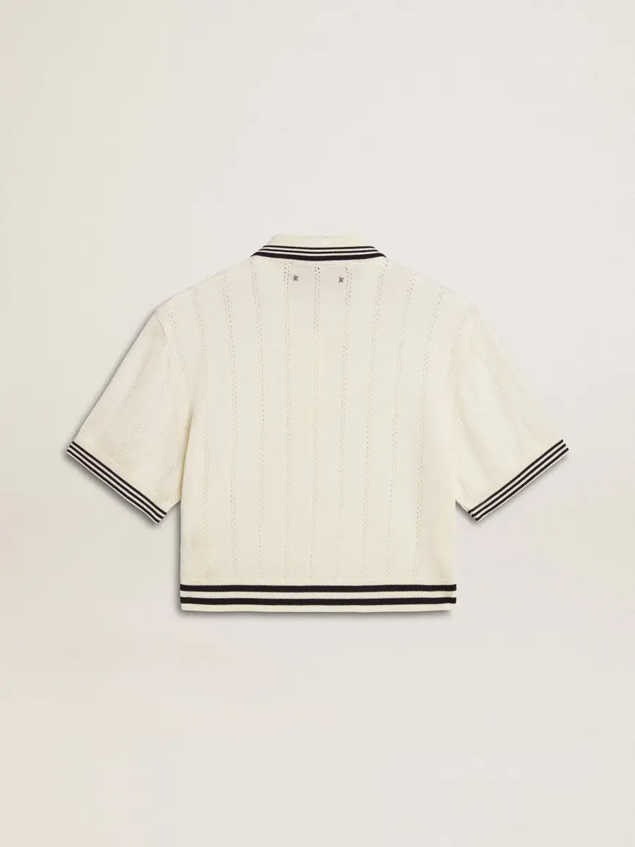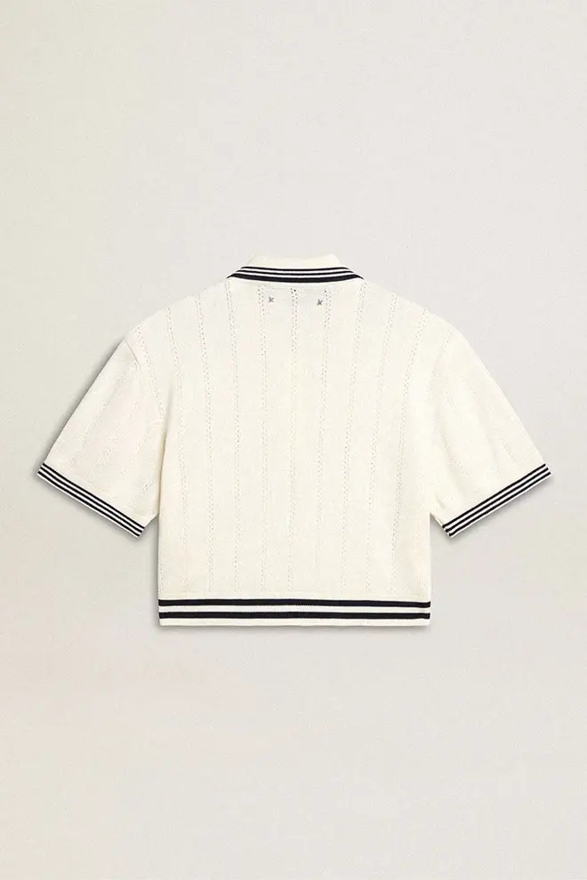Inspirada en la energía eléctrica de los años noventa, la colección celebra el poder ilimitado de los sueños compartidos. Movidos por la pasión, cada diseño captura el significado de la unión y el poder de la música. Confeccionado en algodón blanco desgastado, este polo corto presenta un cierre de tres botones y ribetes azules en contraste.