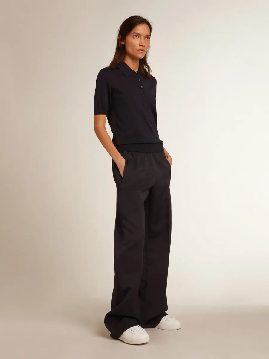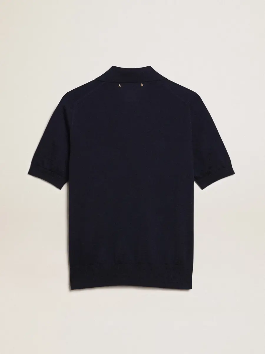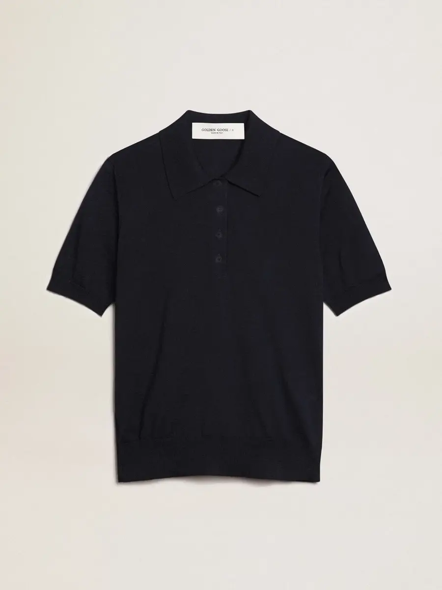 Una colección única y atemporal que encapsula el ADN de Golden Goose, diseñada para acompañarte cada día, en las buenas y en las malas, llueva o haga sol. Este polo de mujer en lana merino azul marino presenta mangas cortas y cuatro botones centrales.