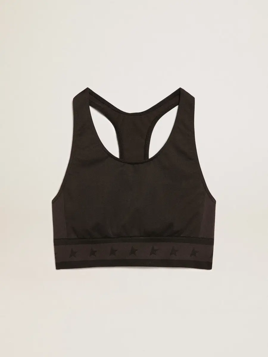 Una colección con un espíritu informal pero versátil: inspirada en los años setenta, tiene un atractivo vintage atemporal, adecuado para cualquier ocasión. Confeccionada con dos hilos tono sobre tono, esta camiseta negra con cuello en U presenta una combinación de puntadas en el lateral que favorecen la silueta y una espalda cruzada, lo que la convierte en una prenda extremadamente versátil. La banda bajo el pecho con estrellas doradas completa el look.