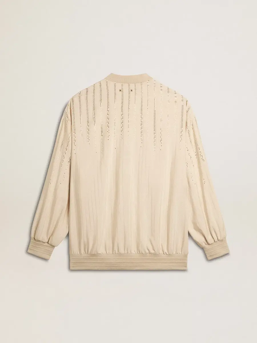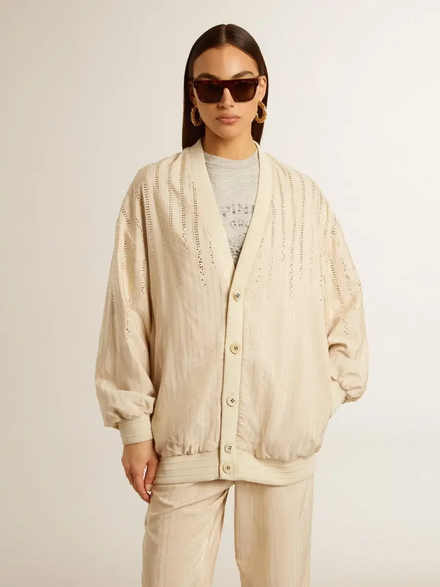 Una historia de amor con nuestra ciudad natal, Marghera. Donde todo comenzó. Nuestra última colección refleja el espíritu de nuestro lugar de origen, sus contrastes, su alma industrial y sus paisajes manufactureros, entrelazando inspiraciones tanto de la vibrante energía de la ropa de trabajo como de la refinada esencia de la sastrería tradicional. Este cárdigan de corte recto en jacquard de seda y viscosa con motivo de rayas finas presenta, en la parte superior, gemas degradadas colocadas alternativamente entre una raya y otra. Los bolsillos en las costuras laterales y los ribetes de punto de mezcla de algodón añaden el toque final.
