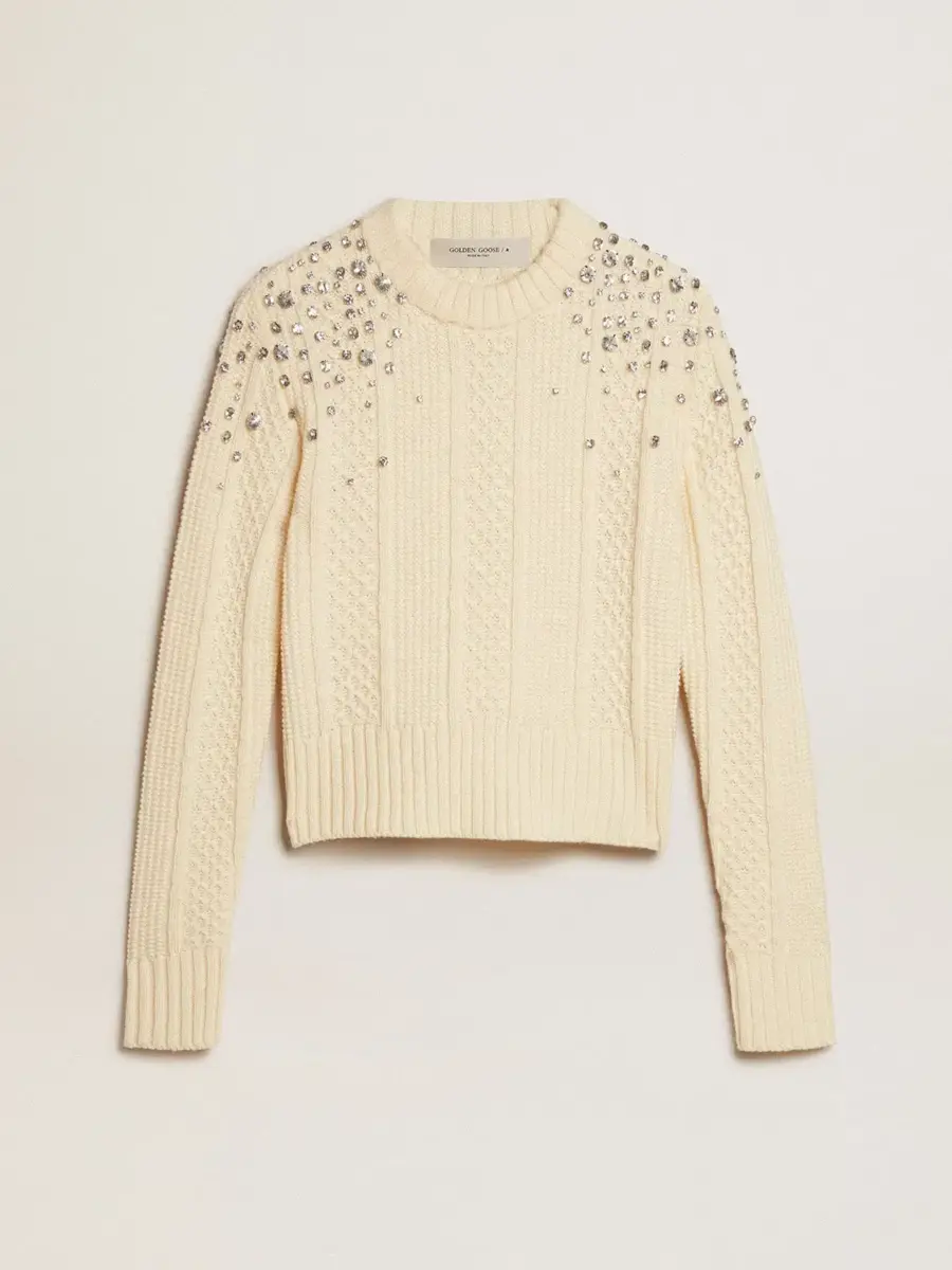 Inspirada en la energía eléctrica de los años noventa, la colección celebra el poder ilimitado de los sueños compartidos. Movidos por la pasión, cada diseño captura el significado de la unión y el poder de la música. Este jersey de cuello redondo desgastado en blanco, de lana pura, presenta un corte corto y bordados en toda la prenda. Los cristales en relieve que decoran la parte superior añaden el toque final.