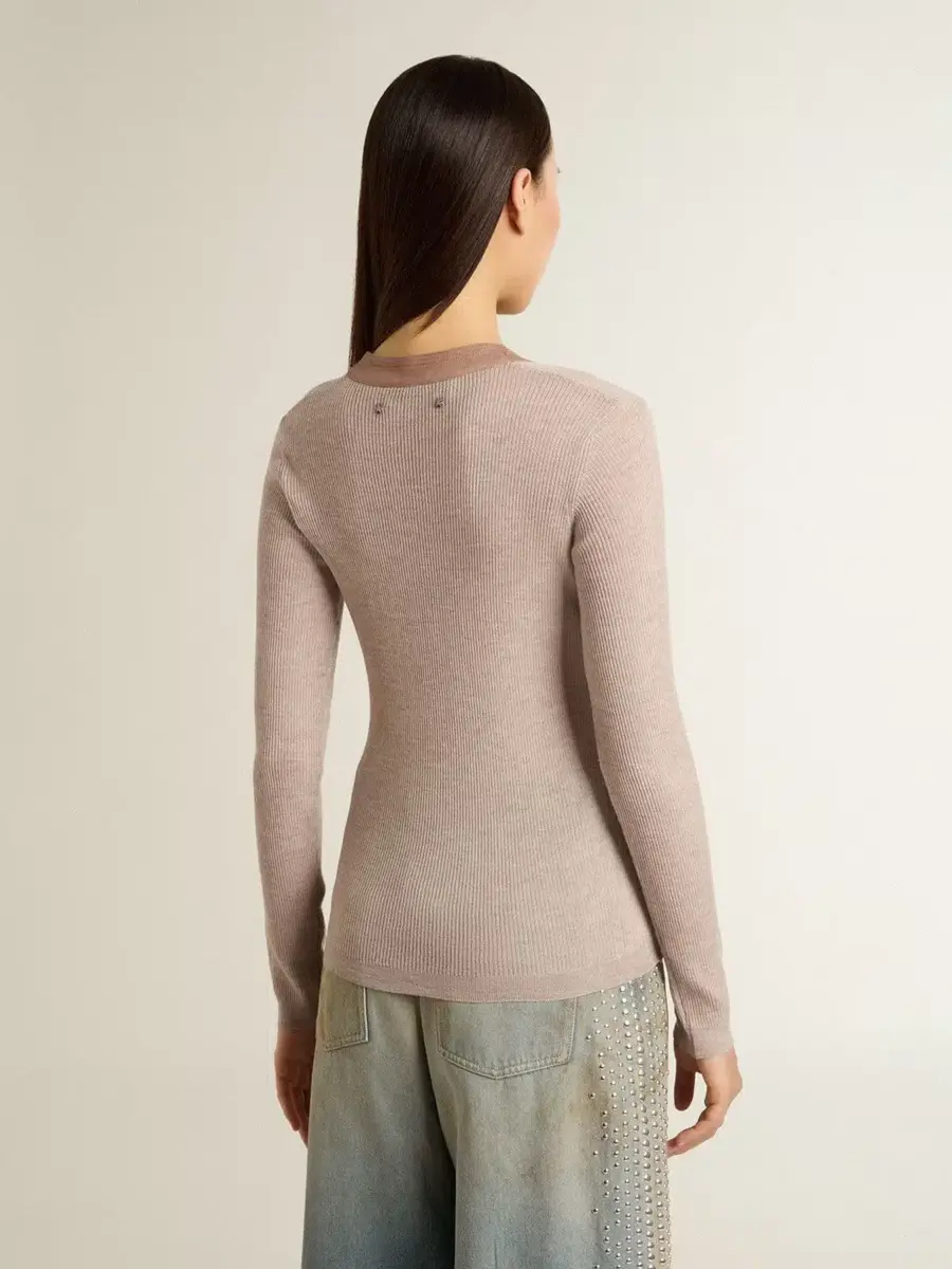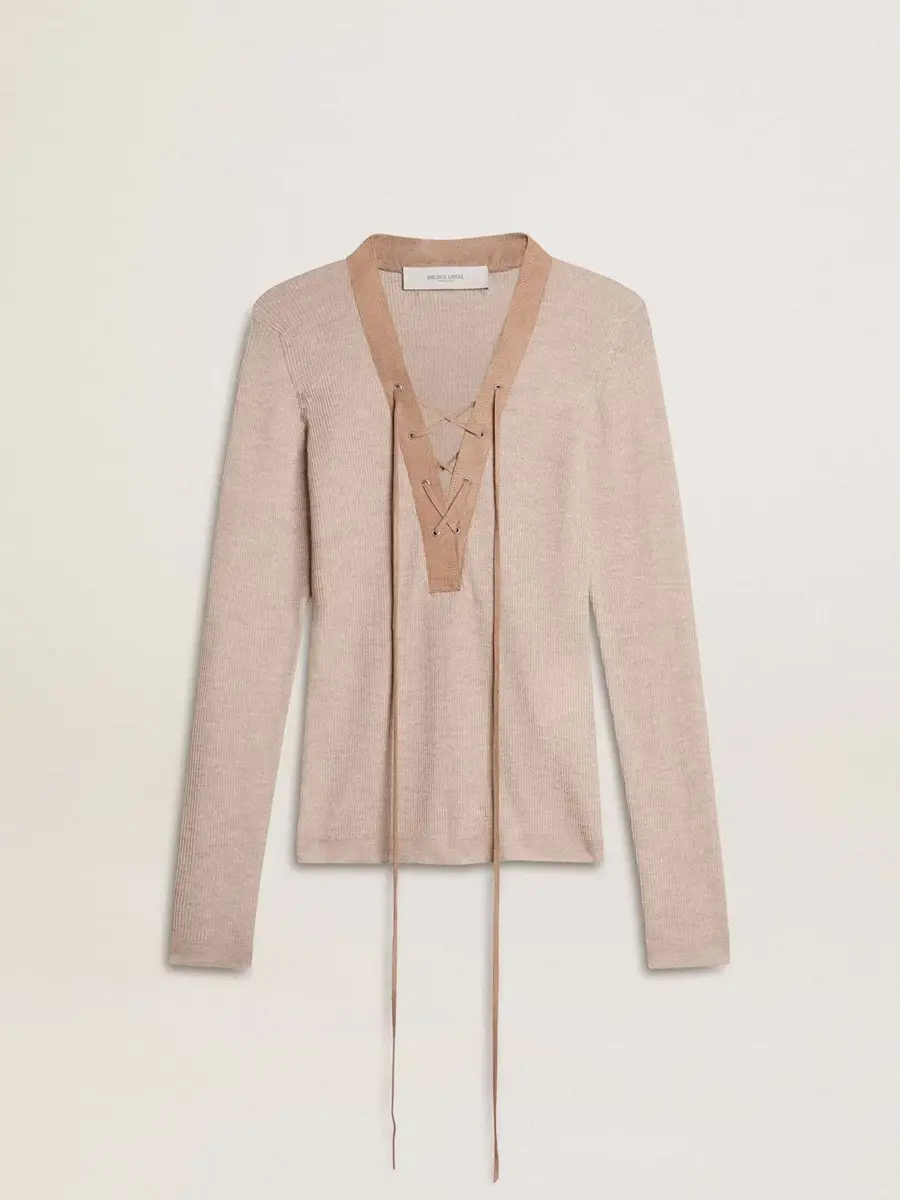 Inspirado en los icónicos años setenta, el espíritu despreocupado de esa época cobra vida con el primer lanzamiento de nuestra colección Otoño/Invierno 25. Este jersey de lana beige de corte recto presenta un inserto de cuero beige en el cuello con un detalle tejido. La doble estrella en la espalda le da el toque final.