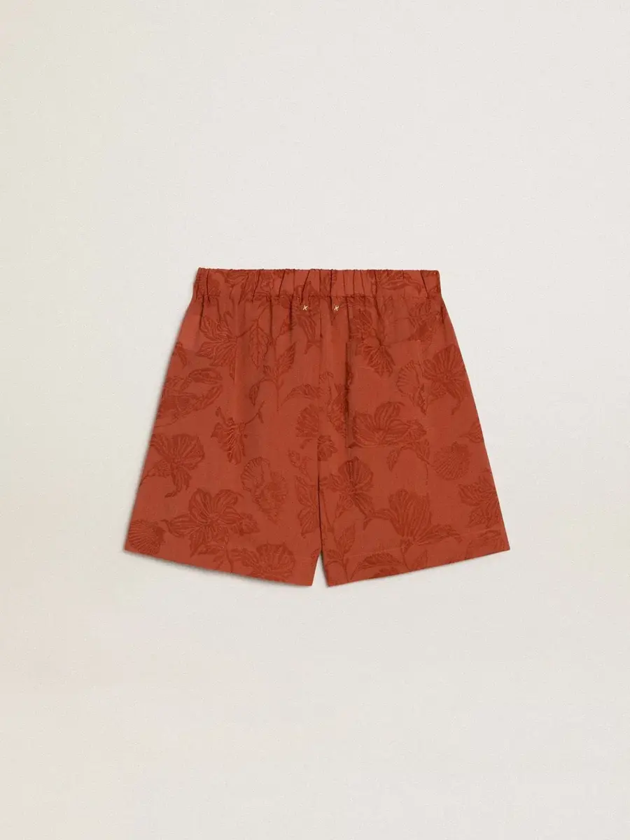 Pantalones cortos de mujer en jacquard rojo ladrillo con estampado floral marino