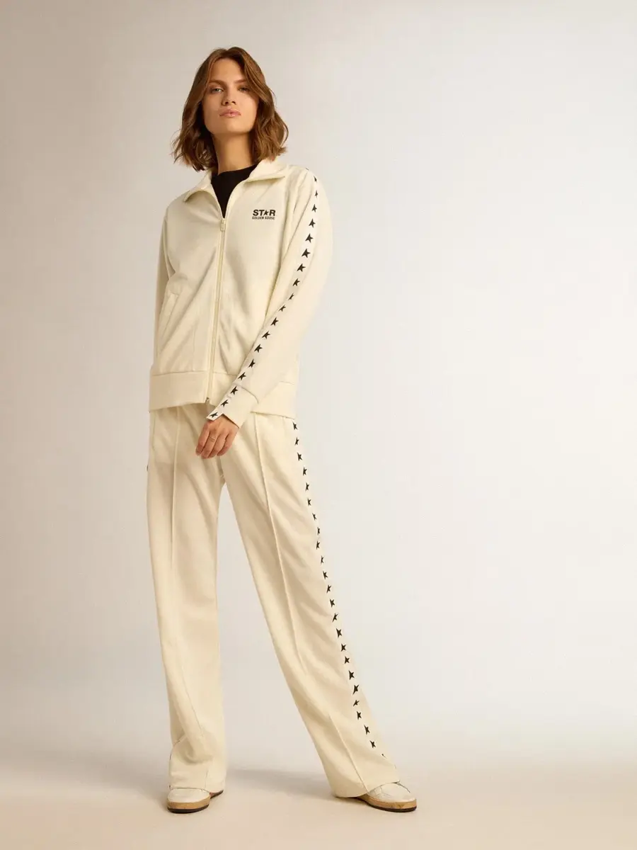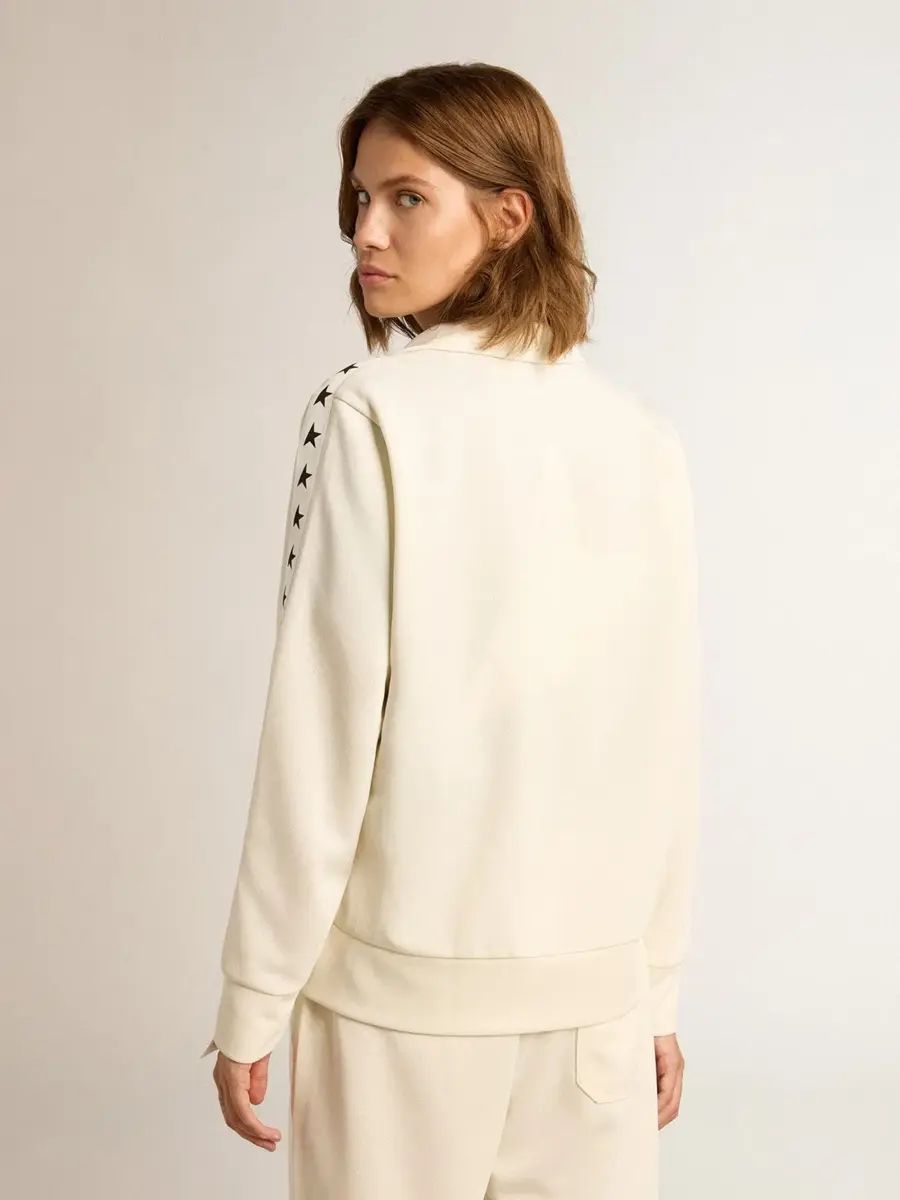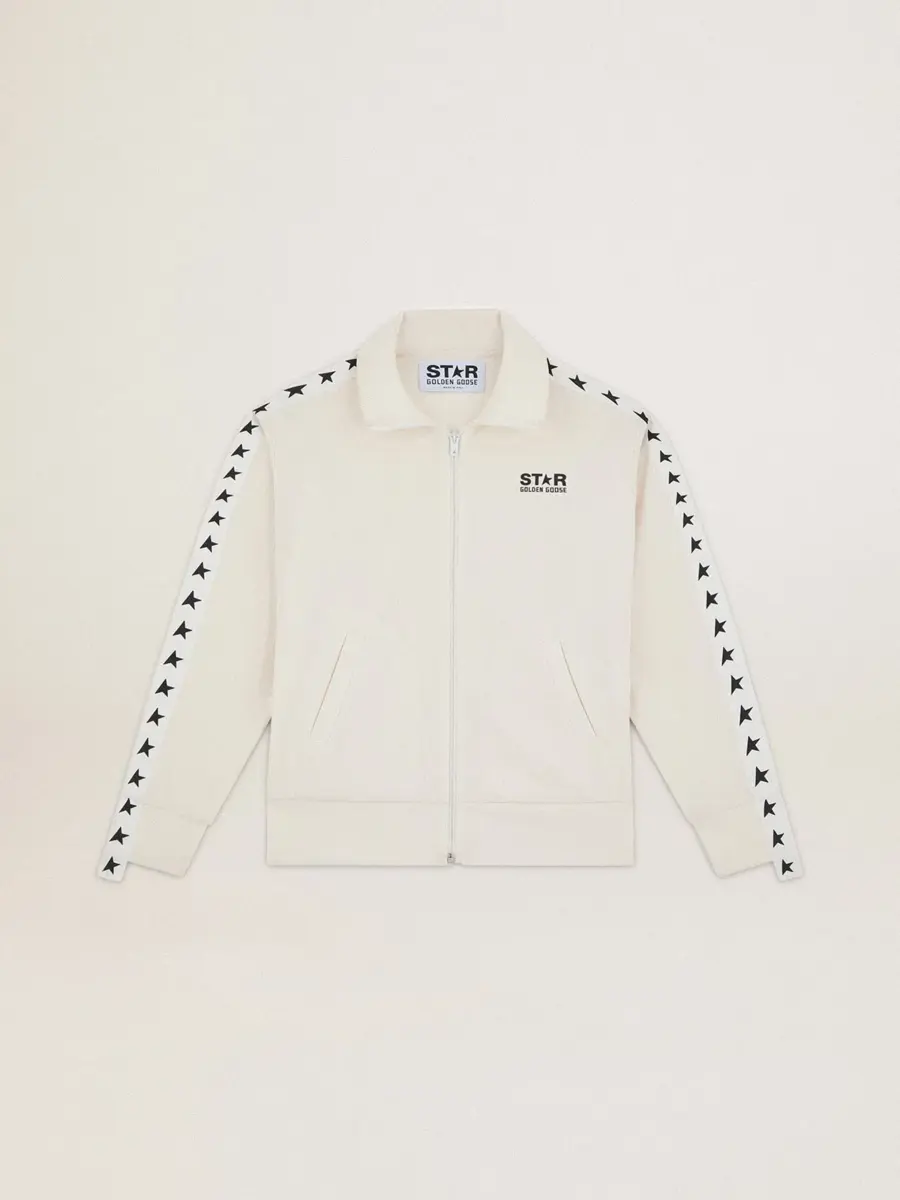 Una colección con un espíritu informal pero versátil: inspirada en los años setenta, tiene un atractivo vintage atemporal, adecuado para cualquier ocasión o look. Esta sudadera con cremallera y corte recto para hombre, confeccionada en jersey técnico blanco papiro, presenta una franja de grogrén blanco en las mangas con estrellas negras en contraste. El logotipo en contraste en la parte delantera le da el toque final.
