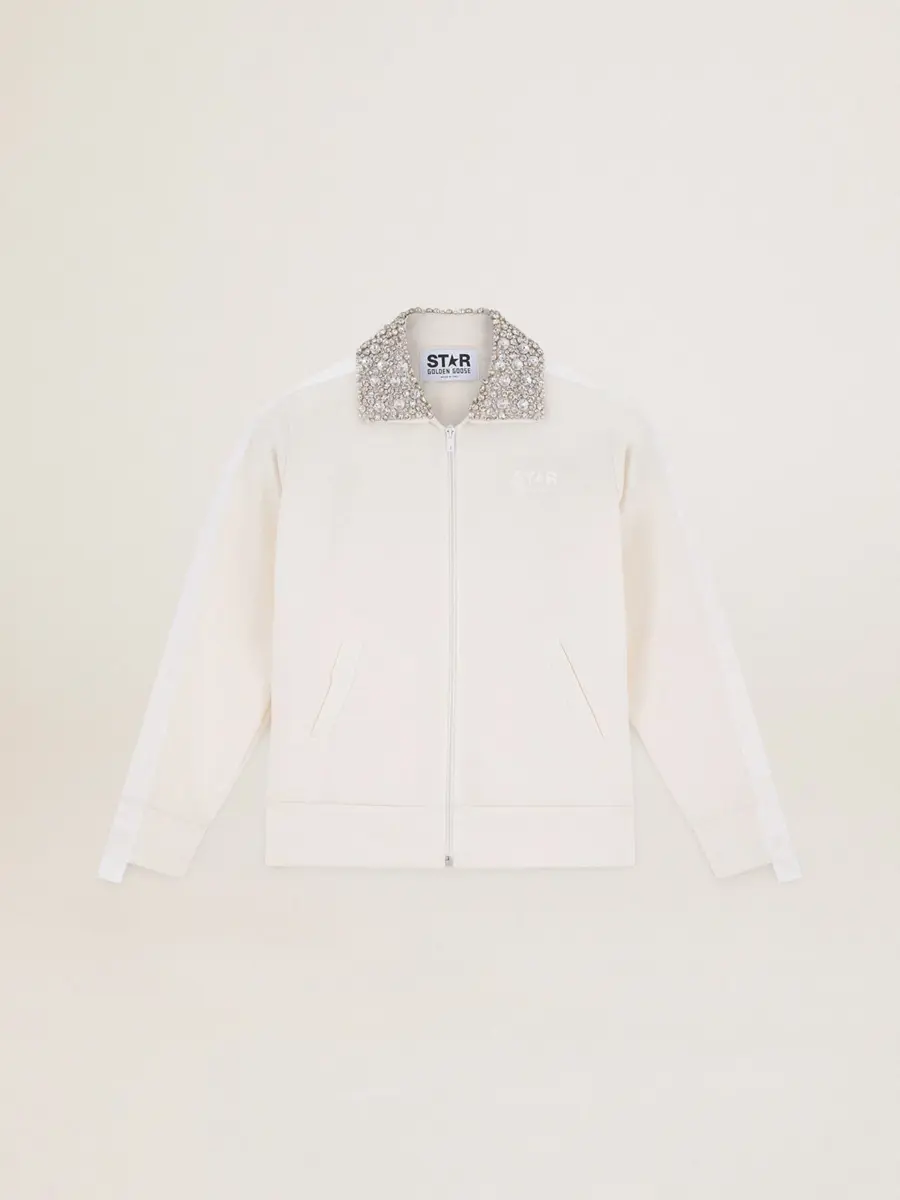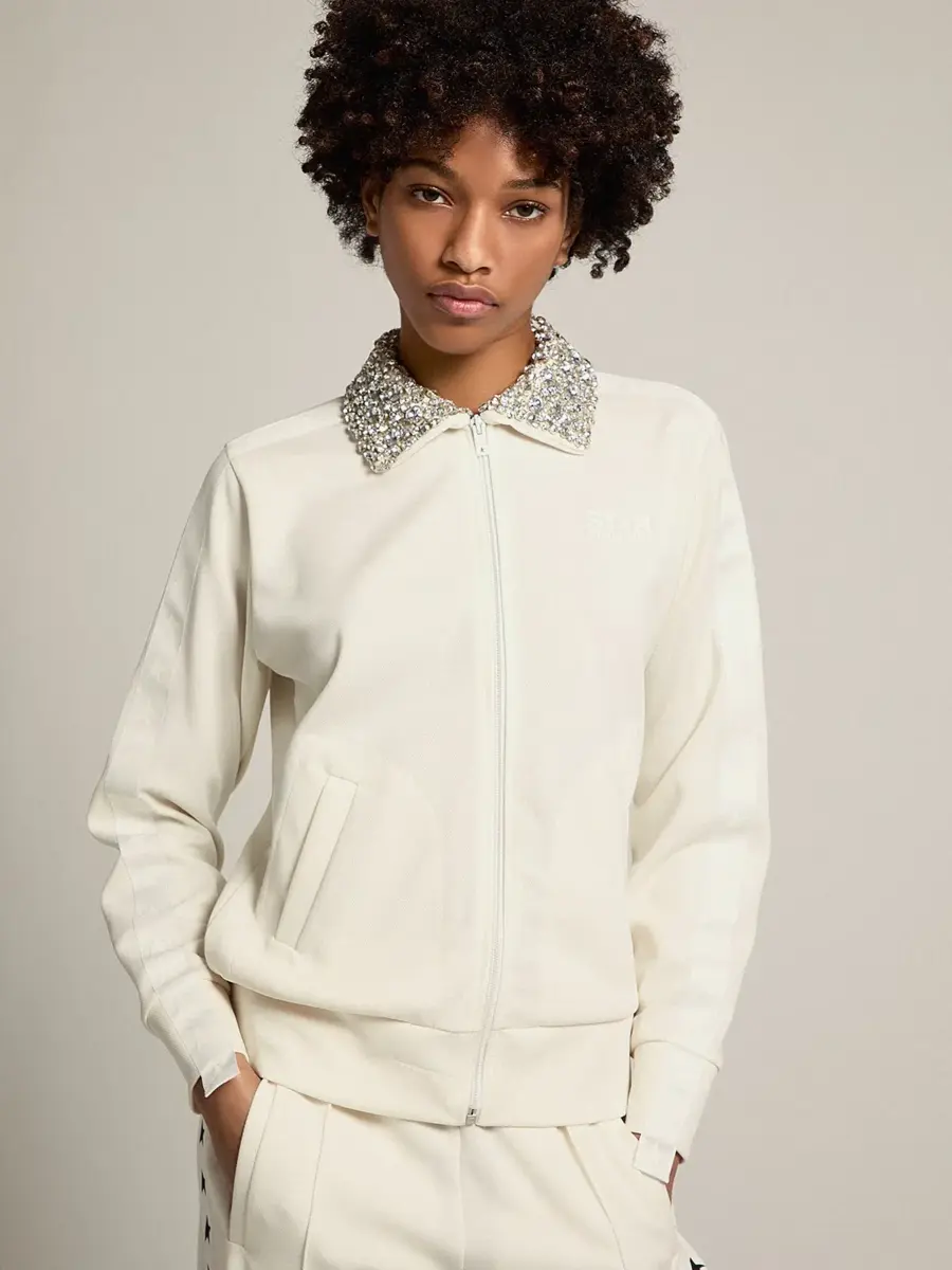 Una colección con un espíritu informal pero versátil: inspirada en los años setenta, tiene un atractivo vintage atemporal, adecuado para cualquier ocasión o look. Con cremallera y corte recto, esta sudadera en triacetato texturizado blanco papiro presenta un precioso cuello de cristales cosidos a mano y una banda de grogrén tono sobre tono en las mangas con estrellas blancas. El logotipo tono sobre tono en la parte delantera le da el toque final. Un toque precioso para alegrar tus aventuras cotidianas.