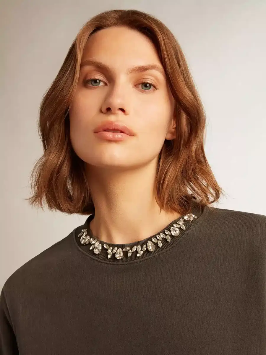 Una colección única y atemporal que engloba la esencia de Golden Goose, diseñada para acompañarte cada día y acompañarte en tus altibajos, llueva o haga sol. Confeccionada en algodón gris antracita con un tratamiento desgastado, esta sudadera de corte regular presenta cristales cabujones en el cuello.