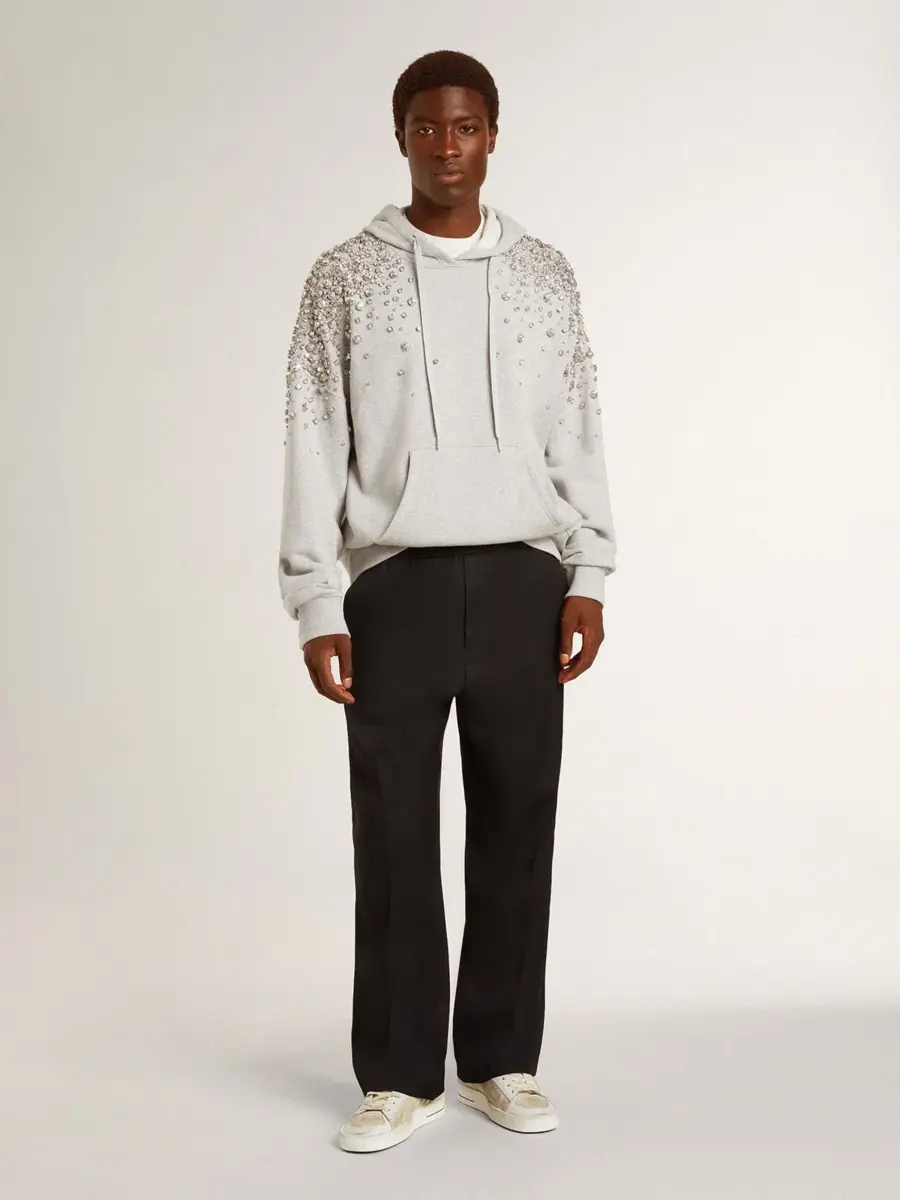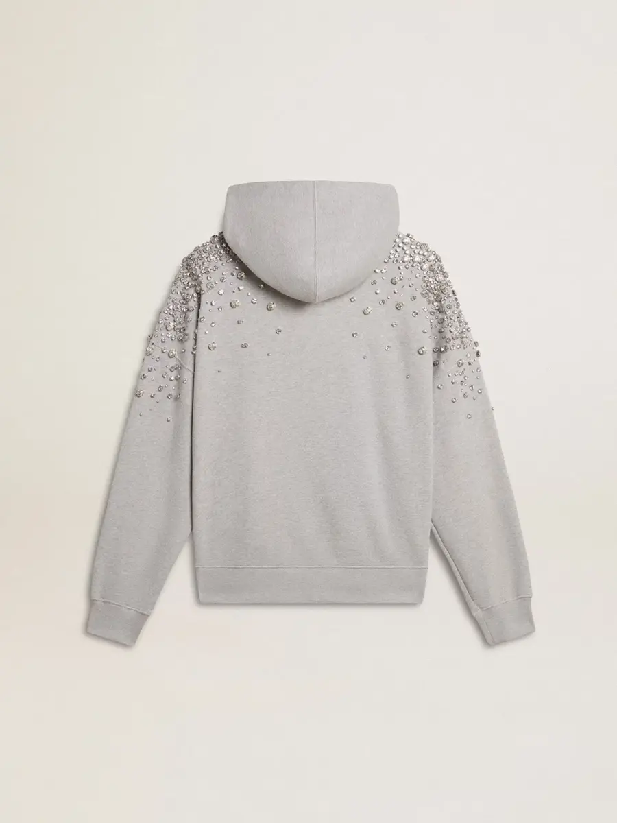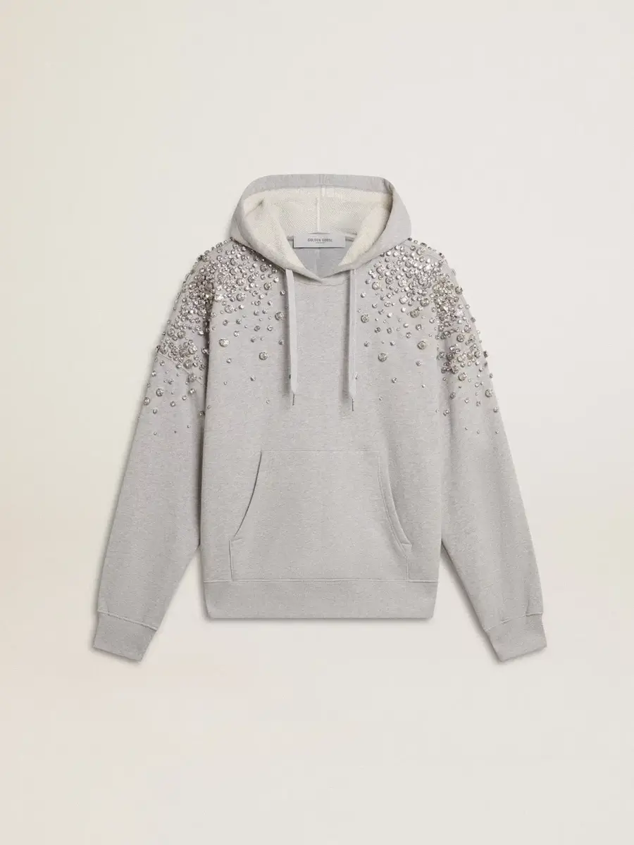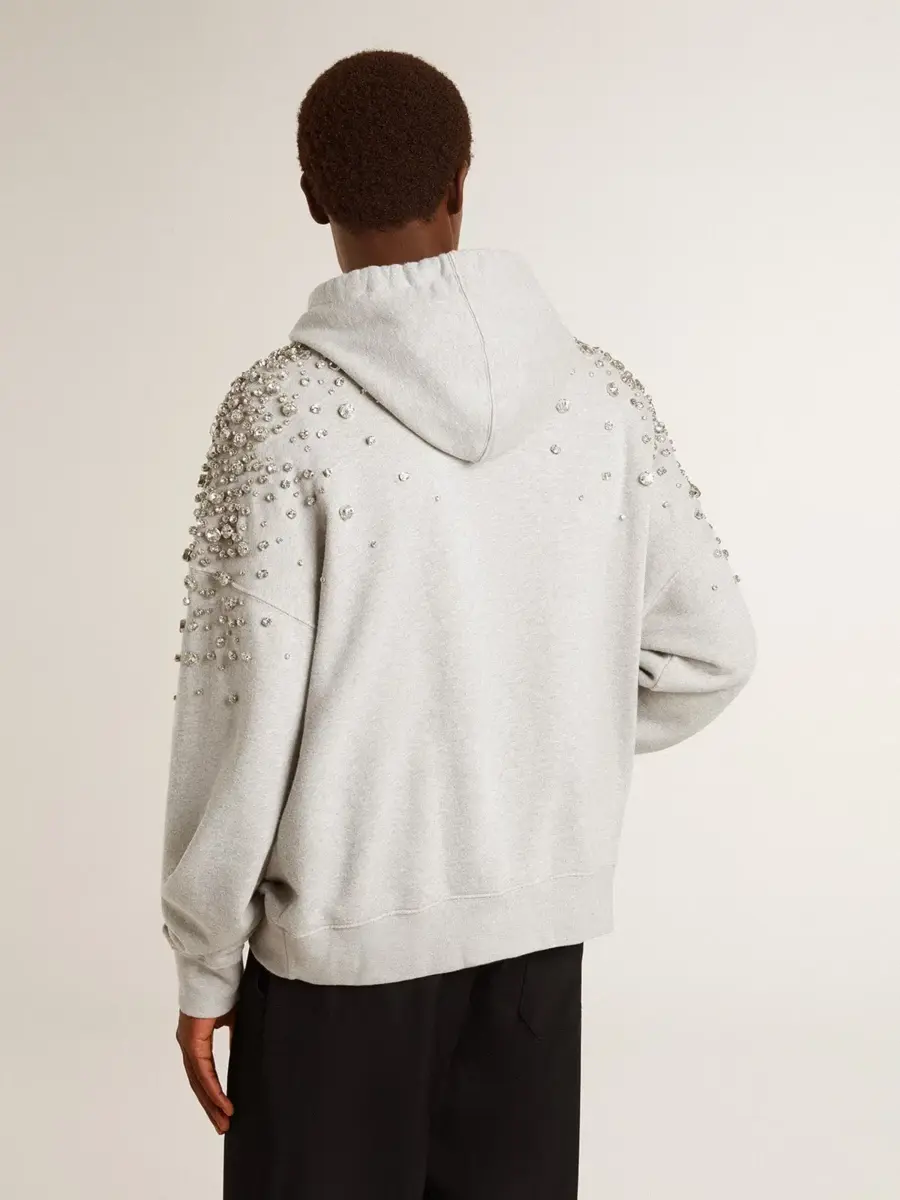 Inspirada en la energía eléctrica de los años noventa, la colección celebra el poder ilimitado de los sueños compartidos. Movidos por la pasión, cada diseño captura el significado de la unión y el poder de la música. Esta sudadera unisex de algodón gris presenta cristales de diferentes tamaños aplicados a mano con efecto degradado. Y como toque final, el bolsillo delantero y la capucha la hacen perfecta para cualquier ocasión.