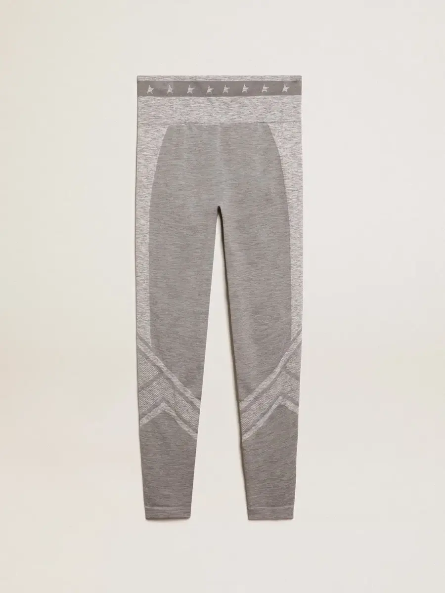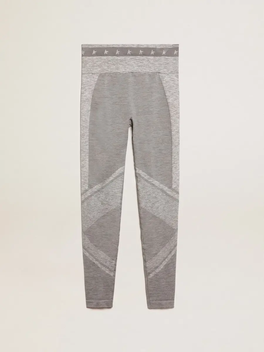 Una colección con un espíritu informal pero versátil: inspirada en los años setenta, tiene un atractivo vintage atemporal, adecuado para cualquier ocasión. Confeccionados con dos hilos tono sobre tono, estos leggings gris jaspeado presentan una combinación de costuras en los laterales que favorecen la figura. La cintura con estrellas doradas completa el look.