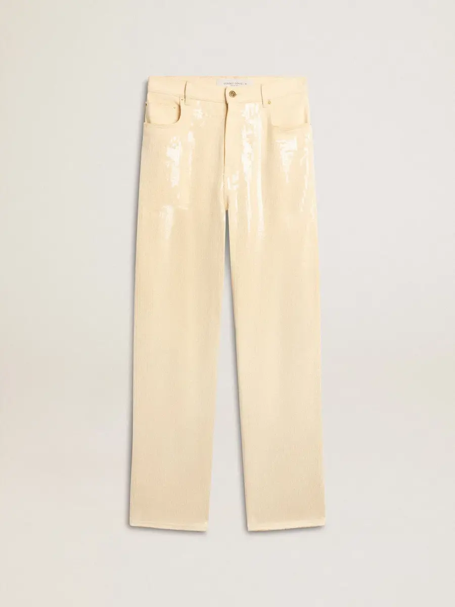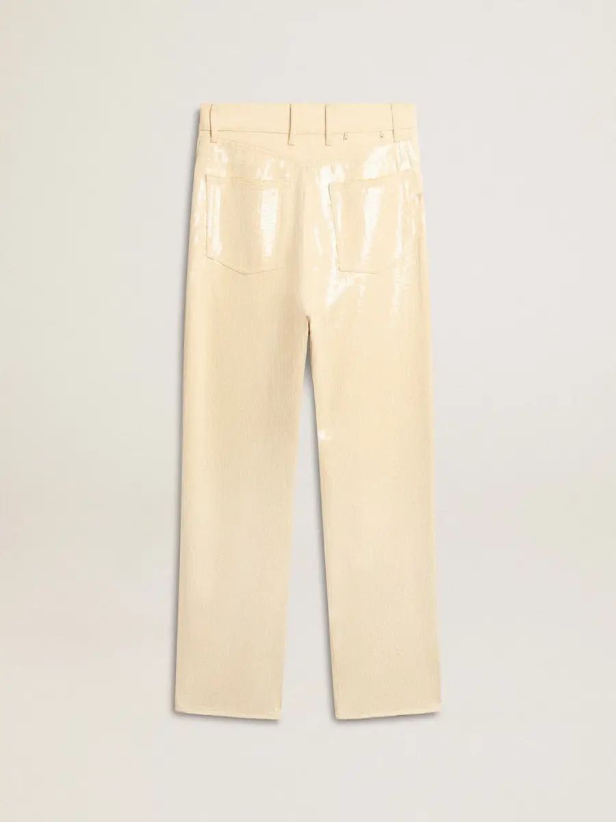 Una historia de amor con nuestra ciudad natal, Marghera. Donde todo comenzó. Nuestra última colección refleja el espíritu de nuestro lugar de origen, sus contrastes, su alma industrial y sus paisajes manufactureros, entrelazando inspiraciones tanto de la vibrante energía de la ropa de trabajo como de la refinada esencia de la sastrería tradicional. Con un ajuste regular en la cintura, estos pantalones de algodón de color crudo presentan un corte ancho y lentejuelas transparentes por toda la prenda. Los detalles en oro antiguo añaden el toque final.