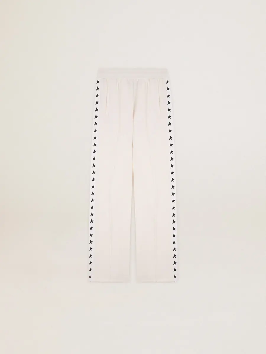 Una colección con un espíritu informal pero versátil: inspirada en los años setenta, tiene un atractivo vintage atemporal, adecuado para cualquier ocasión o look. Inspirados en el mundo de la sastrería, con pliegues cosidos en la parte delantera, estos pantalones de chándal de jersey técnico blanco papiro tienen un corte ajustado. La tira de grogrén blanco en los laterales de las piernas con estrellas negras en contraste añade el toque final.