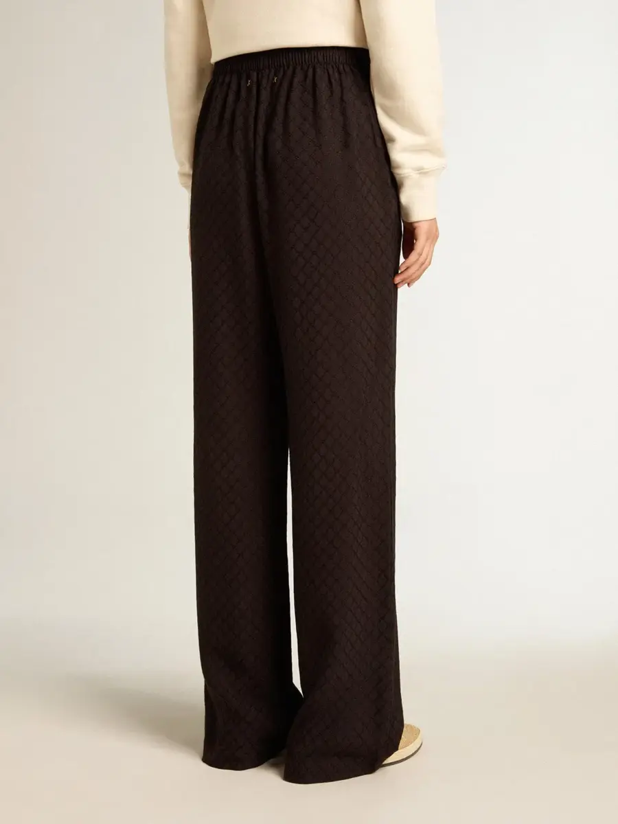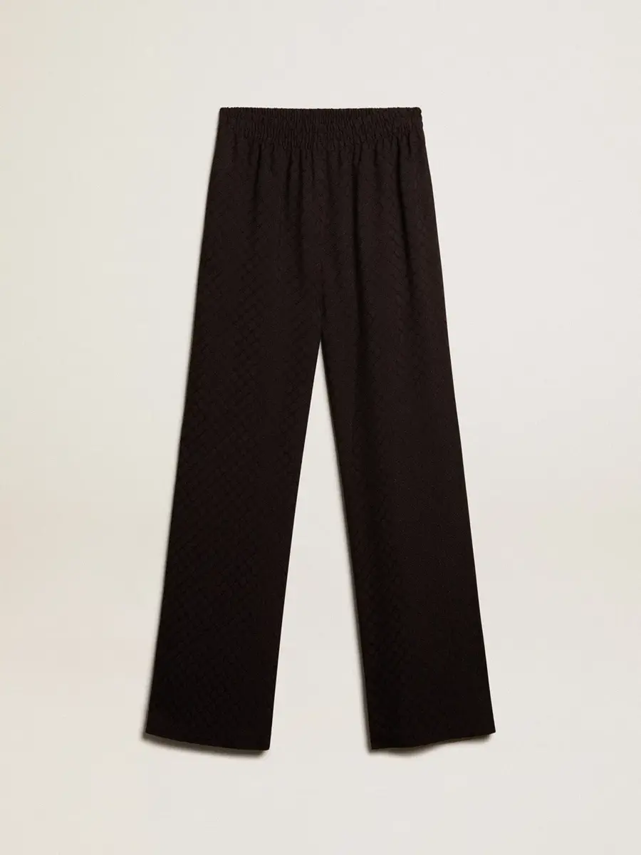 Desde Venecia, nuestro hogar, hasta París, nuestro sueño. La colección Journey captura la esencia y la belleza de los momentos cotidianos en la Ciudad de la Luz, inmersa en una atmósfera hipnótica donde la intimidad, la autenticidad y la curiosidad son el alma palpitante de la misma. Estos elegantes pantalones de chándal de viscosa negra para mujer presentan un corte holgado en las piernas y un estampado de cuadros en toda la prenda.