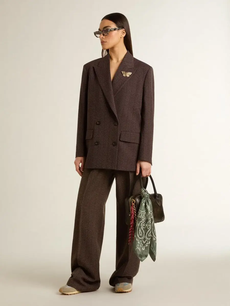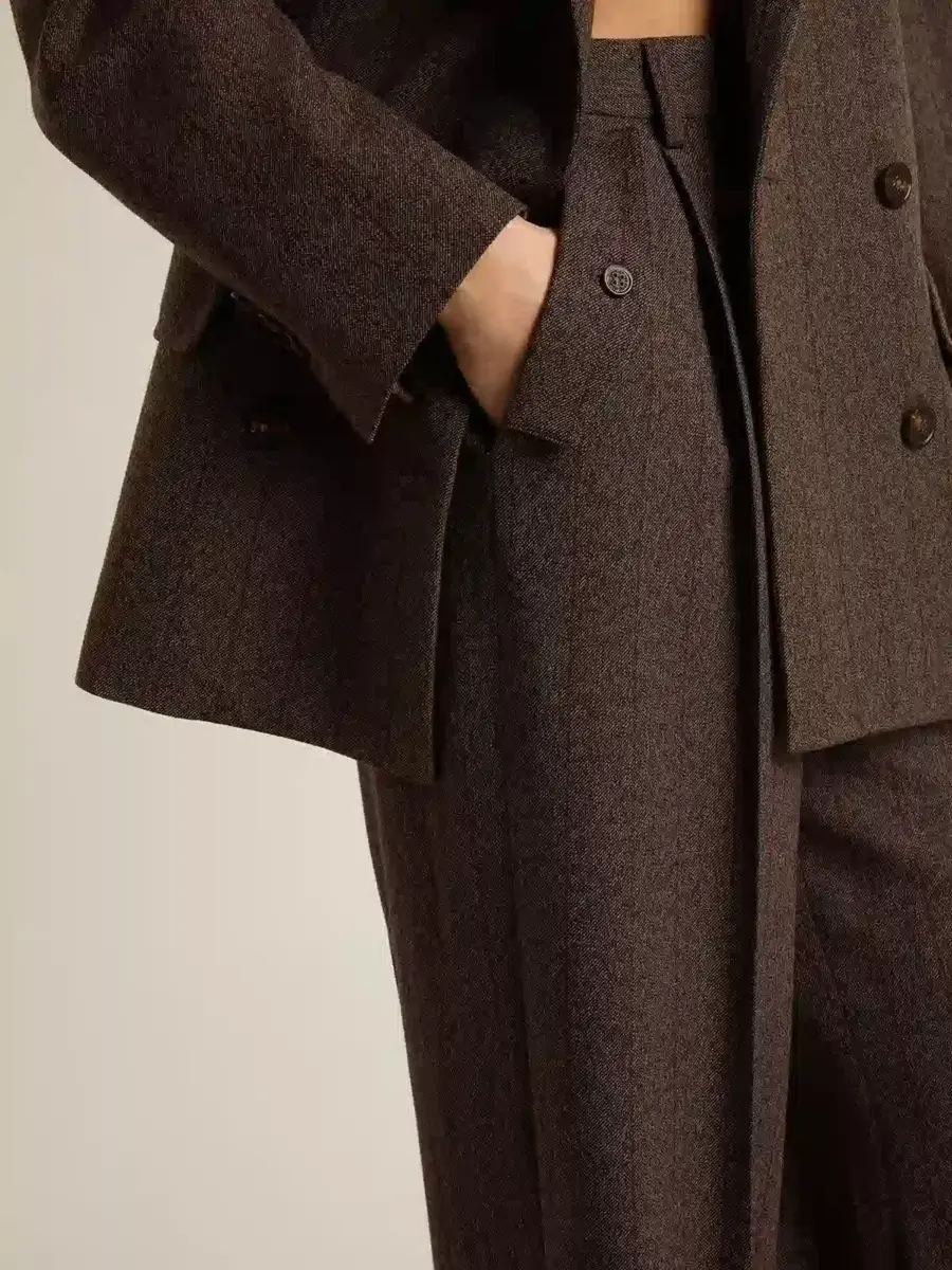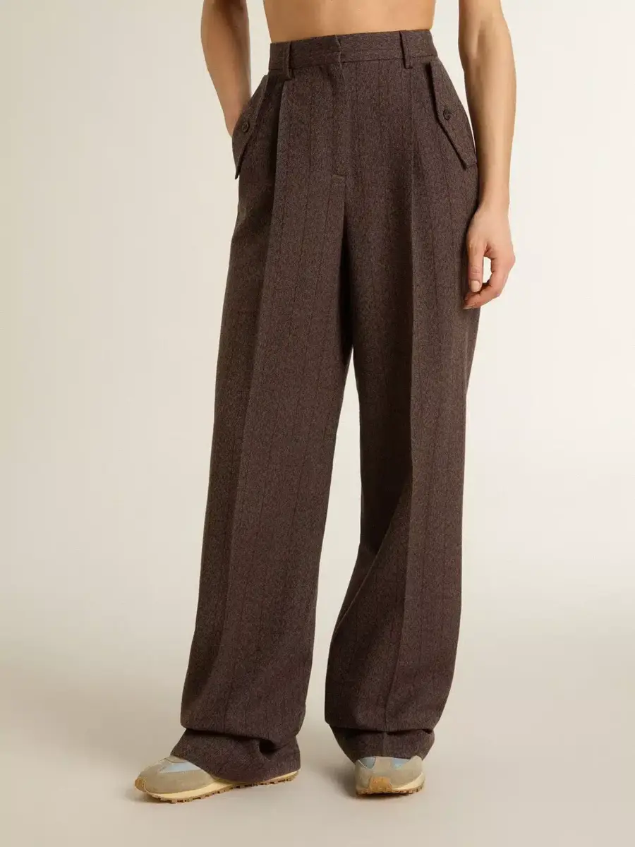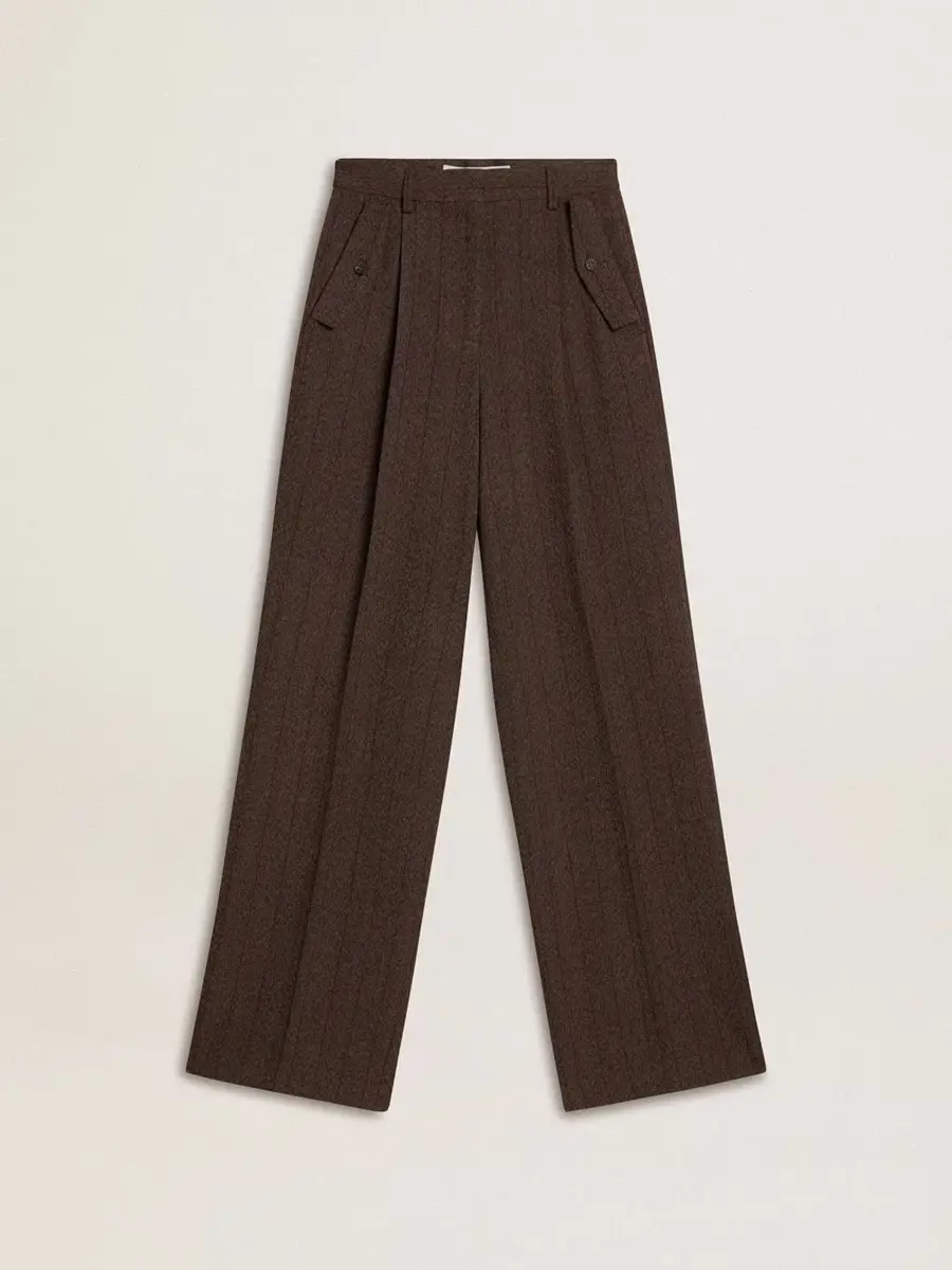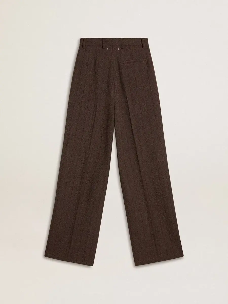 La segunda entrega de la colección Otoño/Invierno 25 se desarrolla como un viaje relajado y refrescante, tejido en el tejido de cada una de las piezas. Estos pantalones de lana marrones para mujer presentan un corte ancho y finas rayas verticales. El doble bolsillo de parche en la parte delantera y la doble estrella en la parte trasera añaden el toque final.