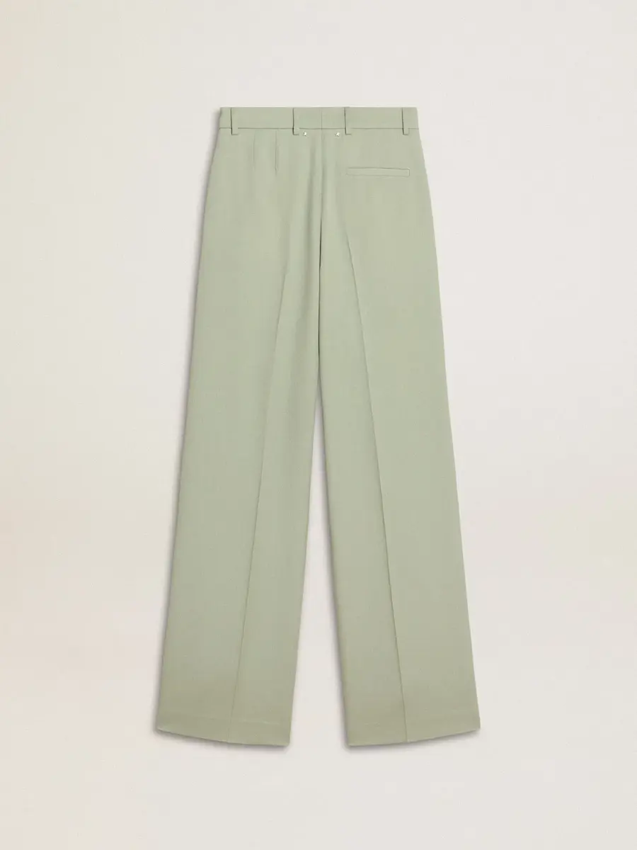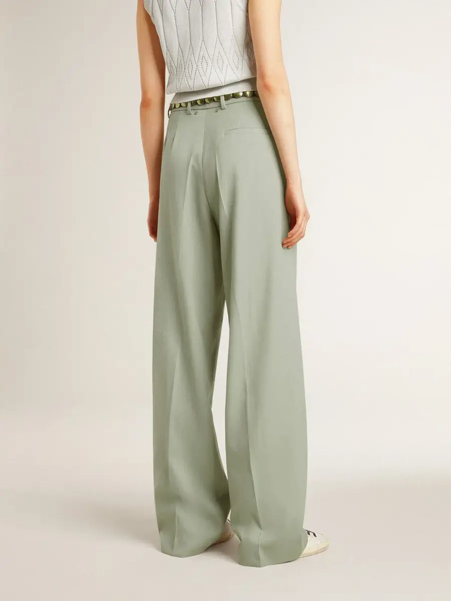 Abrazando la esencia de la temporada, esta colección irradia vitalidad y libertad, combinando una elegancia aireada con chispas dinámicas de energía. Estos pantalones de mujer en lana virgen pura verde salvia presentan un corte relajado con pernera ancha. El cinturón interior y el gancho como cierre central añaden un toque final oculto.