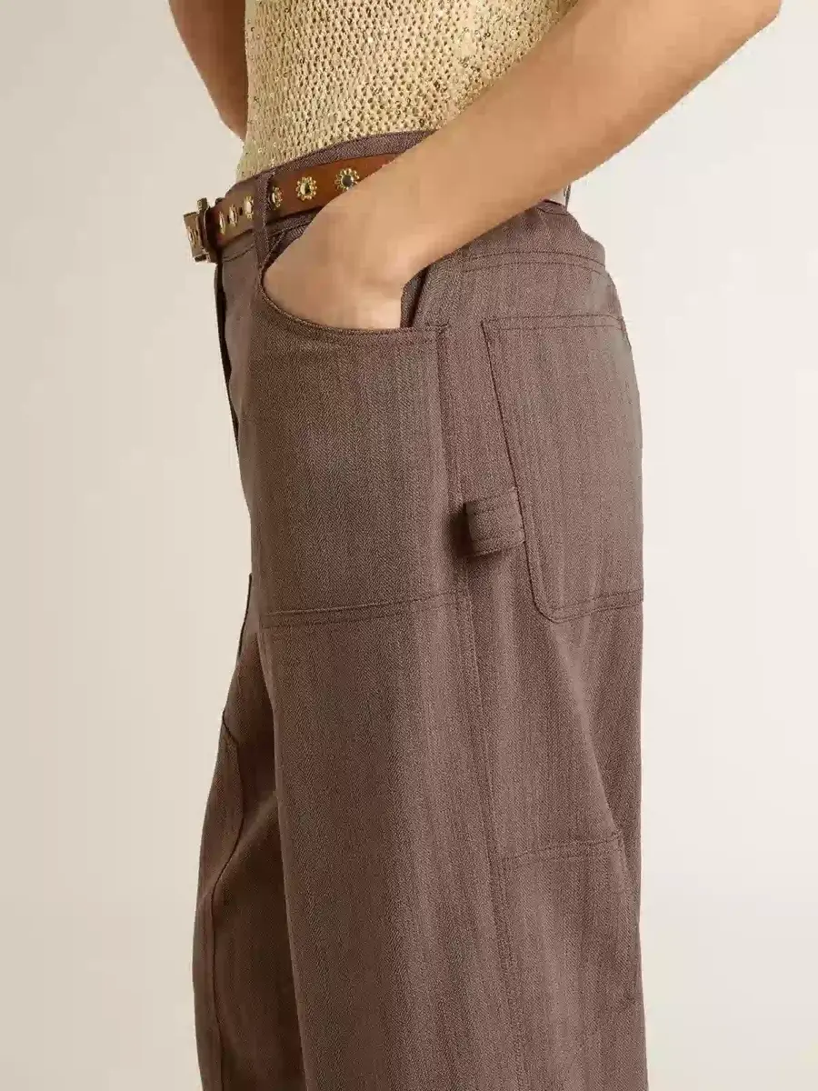 Inspirados en los icónicos años setenta, el espíritu desenfadado de esa época cobra vida con el primer lanzamiento de nuestra colección Otoño/Invierno 25. Estos pantalones de mujer en mezcla de lana virgen marrón claro cuentan con bolsillos delanteros y una presilla para el cinturón en el lado izquierdo. La doble estrella en la parte trasera añade el toque final.