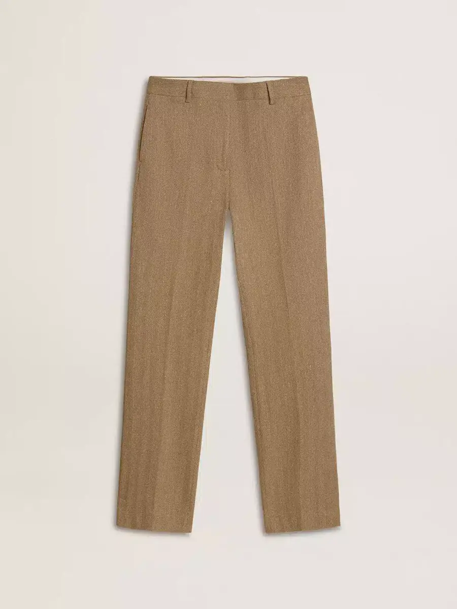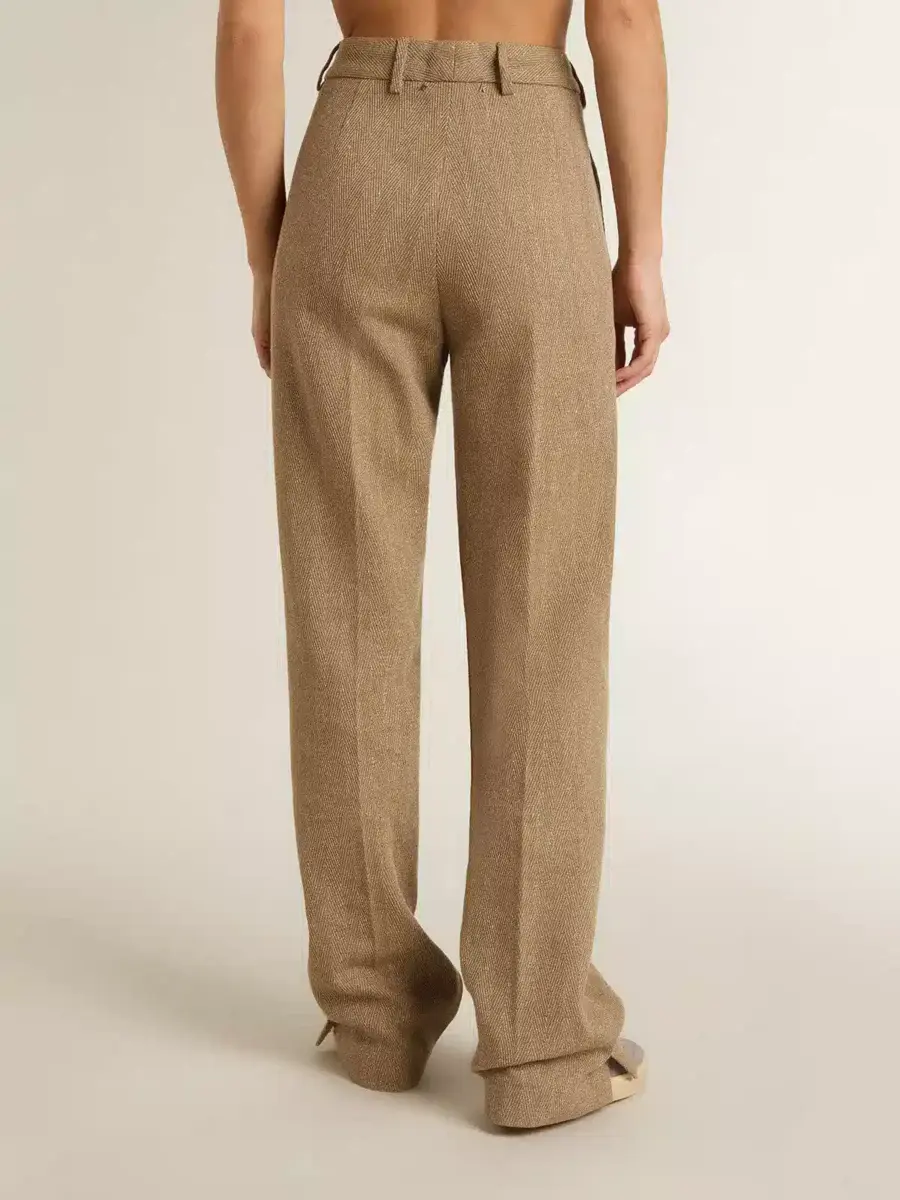 Inspirados en los icónicos años setenta, el espíritu desenfadado de esa época cobra vida con el primer lanzamiento de nuestra colección Otoño/Invierno 25. Estos pantalones de mezcla de lino con diseño en espiga de color arena presentan un corte holgado y dos bolsillos. La doble estrella en la parte trasera añade el toque final.