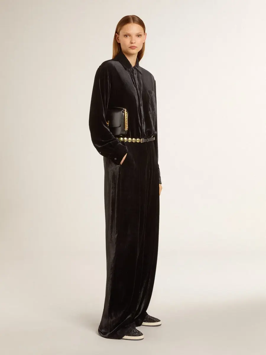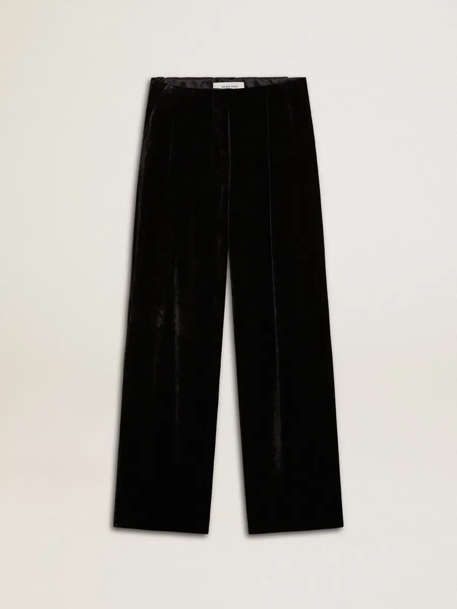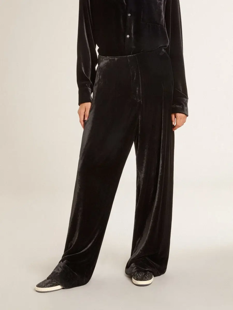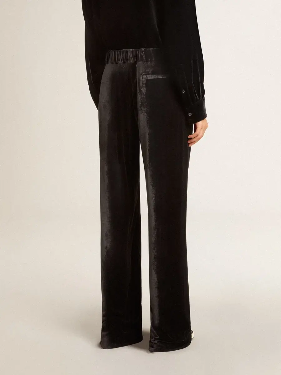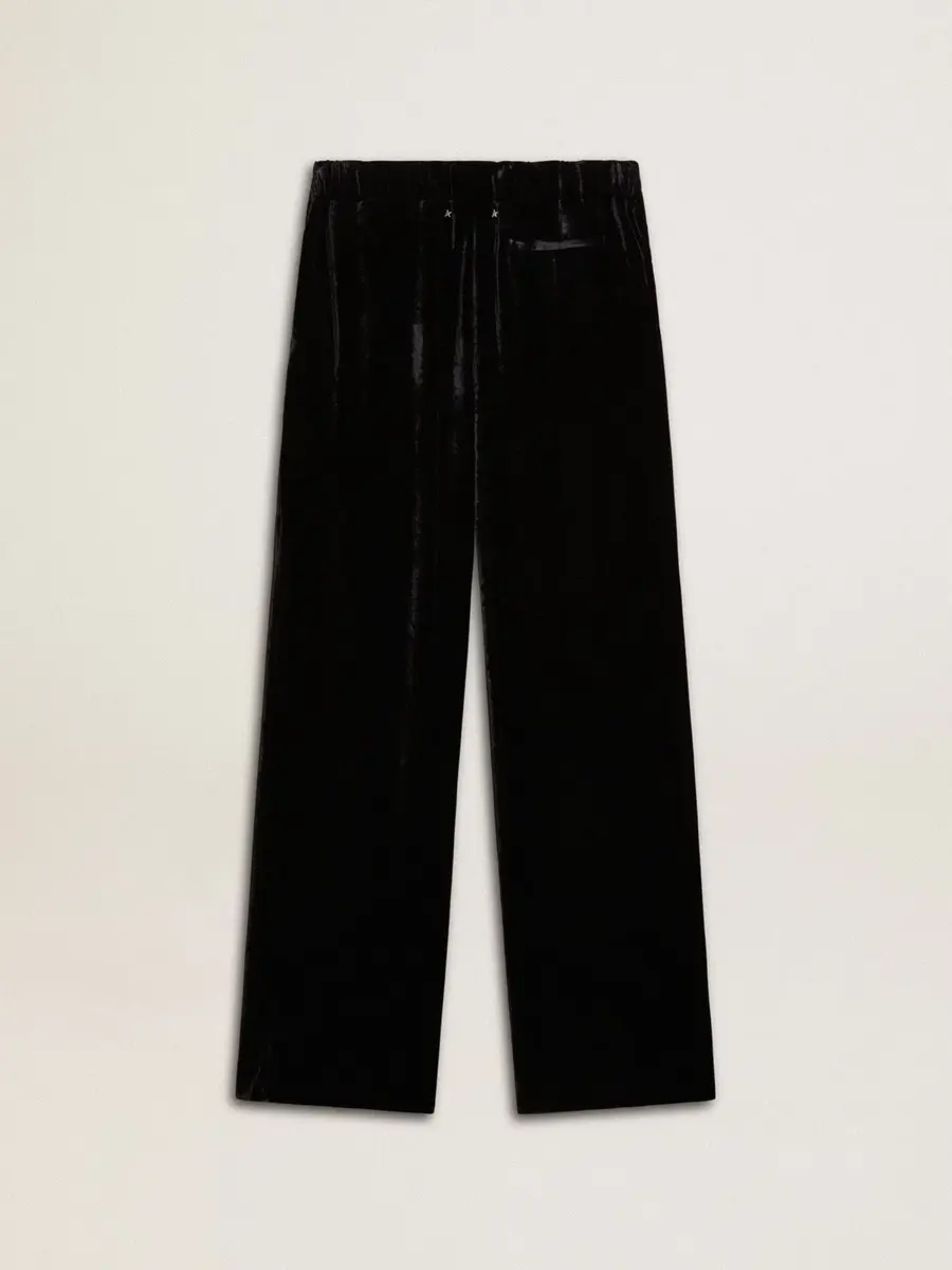 Inspirada en la energía eléctrica de los años noventa, la colección celebra el poder ilimitado de los sueños compartidos. Movidos por la pasión, cada diseño captura el significado de la unión y el poder de la música. Estos pantalones de mezcla de seda negra con efecto terciopelo presentan un corte holgado y pliegues en la parte delantera. La cintura interior elástica añade el toque final.