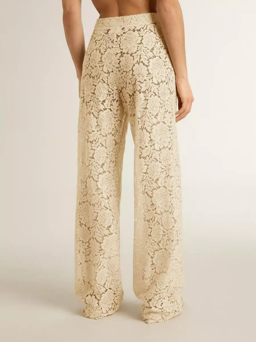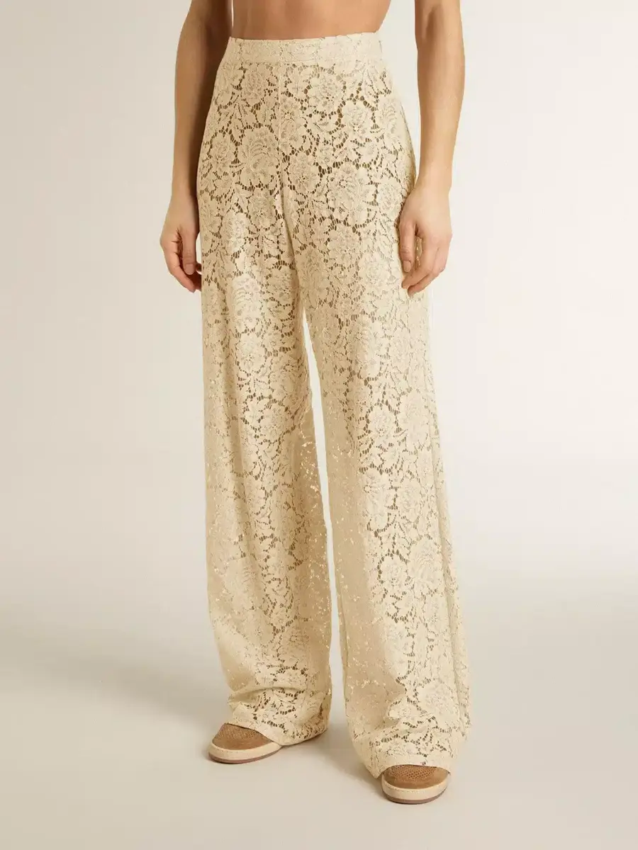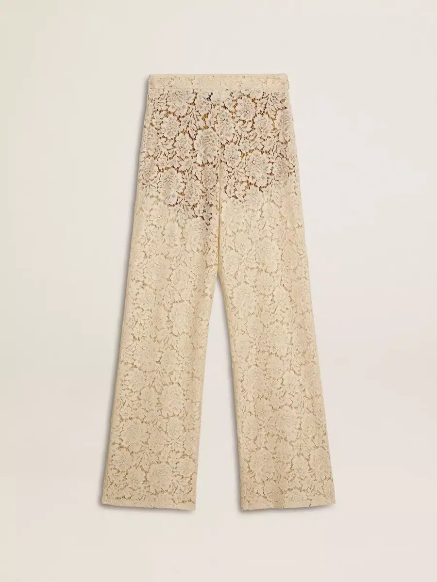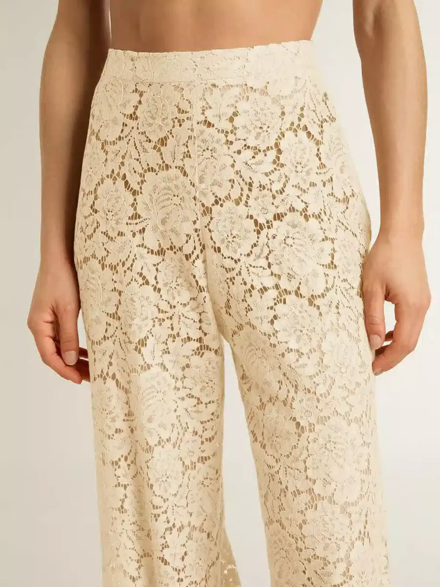 Inspirados en los icónicos años setenta, el espíritu desenfadado de esa época cobra vida con el primer lanzamiento de nuestra colección Otoño/Invierno 25. Estos pantalones joggers suaves de color crema para mujer presentan un motivo floral en encaje con efecto transparente. La cintura elástica añade el toque final.