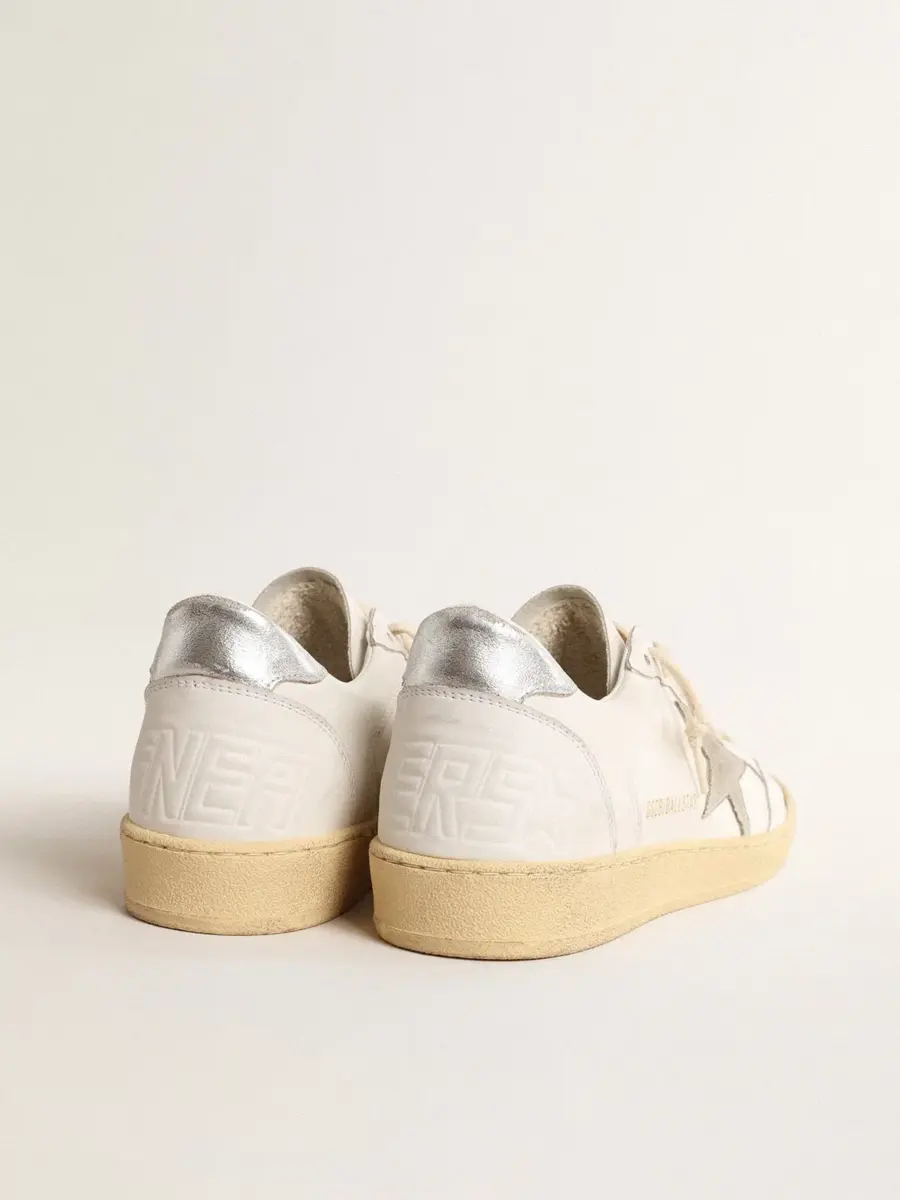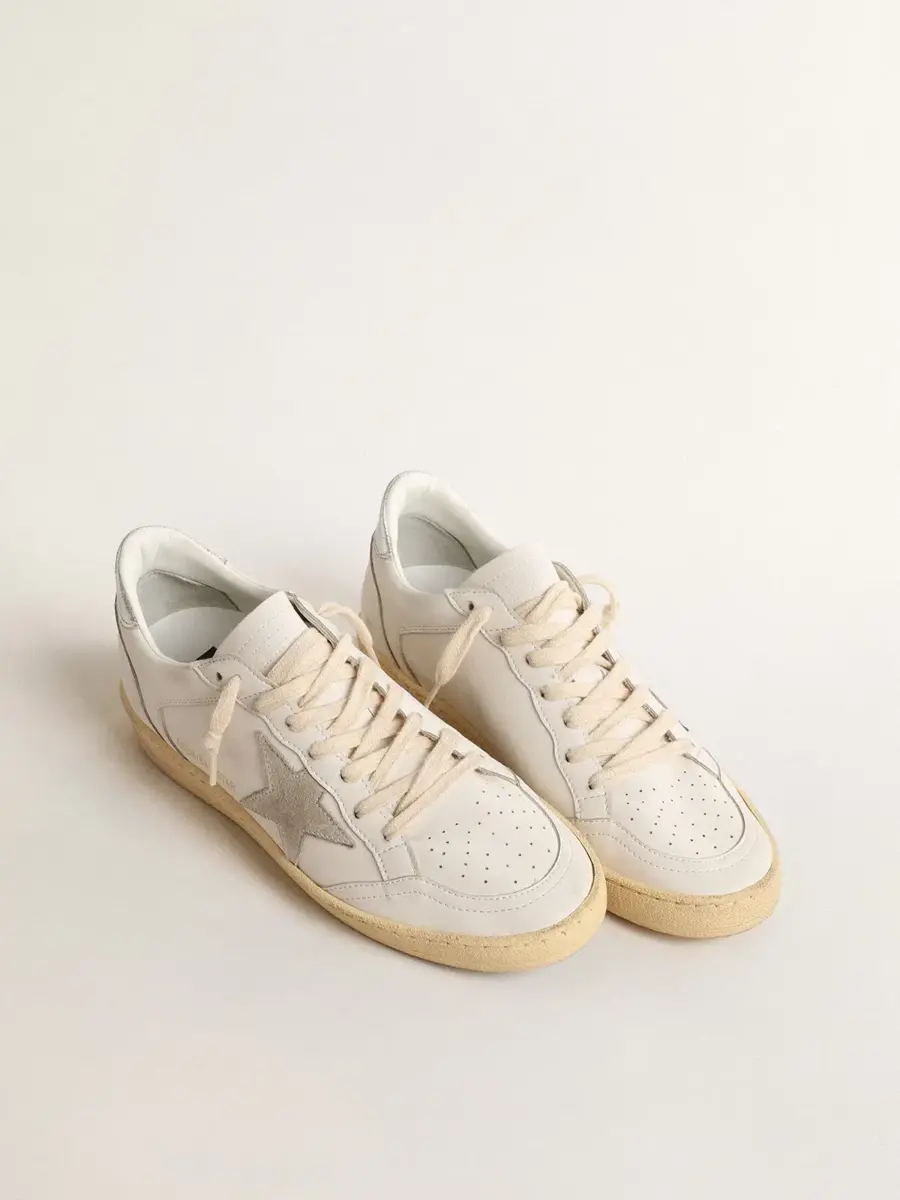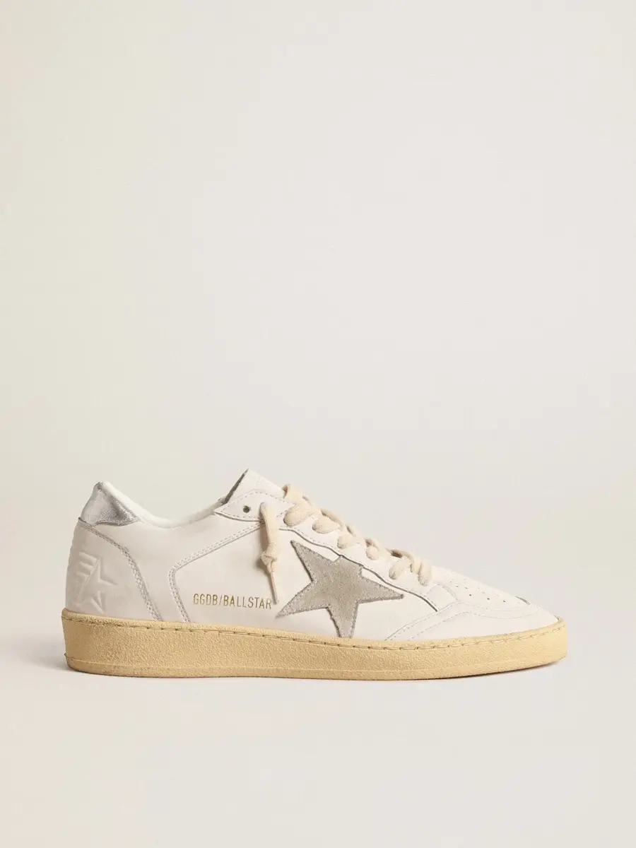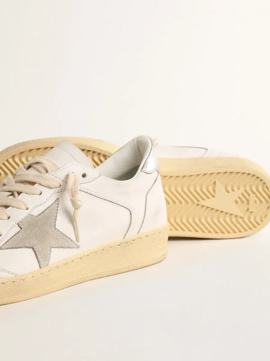 Soñando con los años ochenta. Nuestras zapatillas Ball Star tienen un aire universitario americano, a caballo entre el baloncesto y el skate. Este modelo, con la parte superior de piel blanca, presenta una estrella de ante gris hielo y una lengüeta en el talón de piel metalizada plateada. Y los cordones de color crema añaden el toque final: cosas bonitas que nunca pasan de moda.
