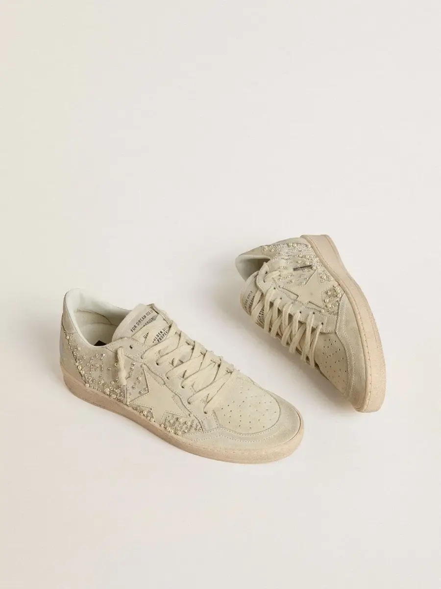 Soñando con los años ochenta. Nuestras zapatillas Ball Star tienen un aire universitario americano, a caballo entre el baloncesto y el skate. Con una parte superior de ante gris claro adornada con cristales Swarovski plateados y bordados de perlas, este modelo cuenta con una estrella de cuero blanco y una lengüeta de ante gris claro en el talón. Y los cordones blancos añaden el toque final: cosas bonitas que nunca pasan de moda.