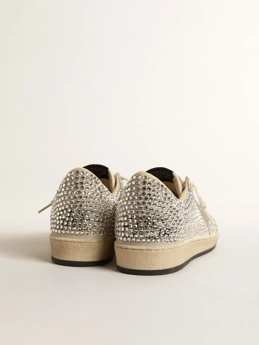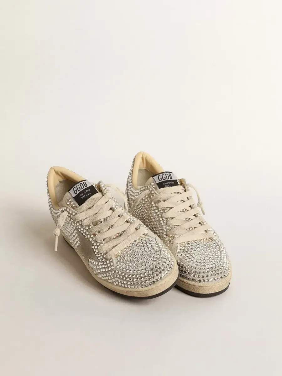 Soñando con los años ochenta. Nuestras zapatillas Ball Star tienen un aire universitario americano, a caballo entre el baloncesto y el skate. Con una parte superior de ante blanco y gris hielo decorada con cristales Swarovski, este modelo para mujer cuenta con una estrella de ante gris hielo y una lengüeta en el talón de ante gris hielo cubierta de cristales Swarovski. Los cordones blancos desgastados añaden el toque final: cosas bonitas que nunca pasan de moda.