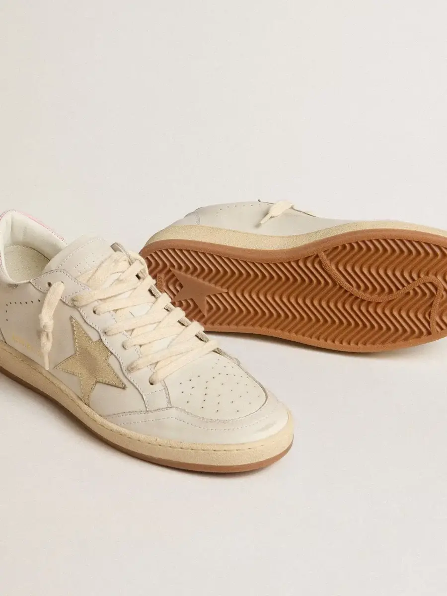 Soñando con los años ochenta. Nuestras zapatillas Ball Star tienen un aire universitario americano, a medio camino entre el baloncesto y el skate. Este modelo para mujer, con parte superior de piel blanca, cuenta con una estrella de piel dorada y una lengüeta de piel rosa en el talón. Los cordones color crema le dan el toque final: cosas bonitas que nunca pasan de moda.