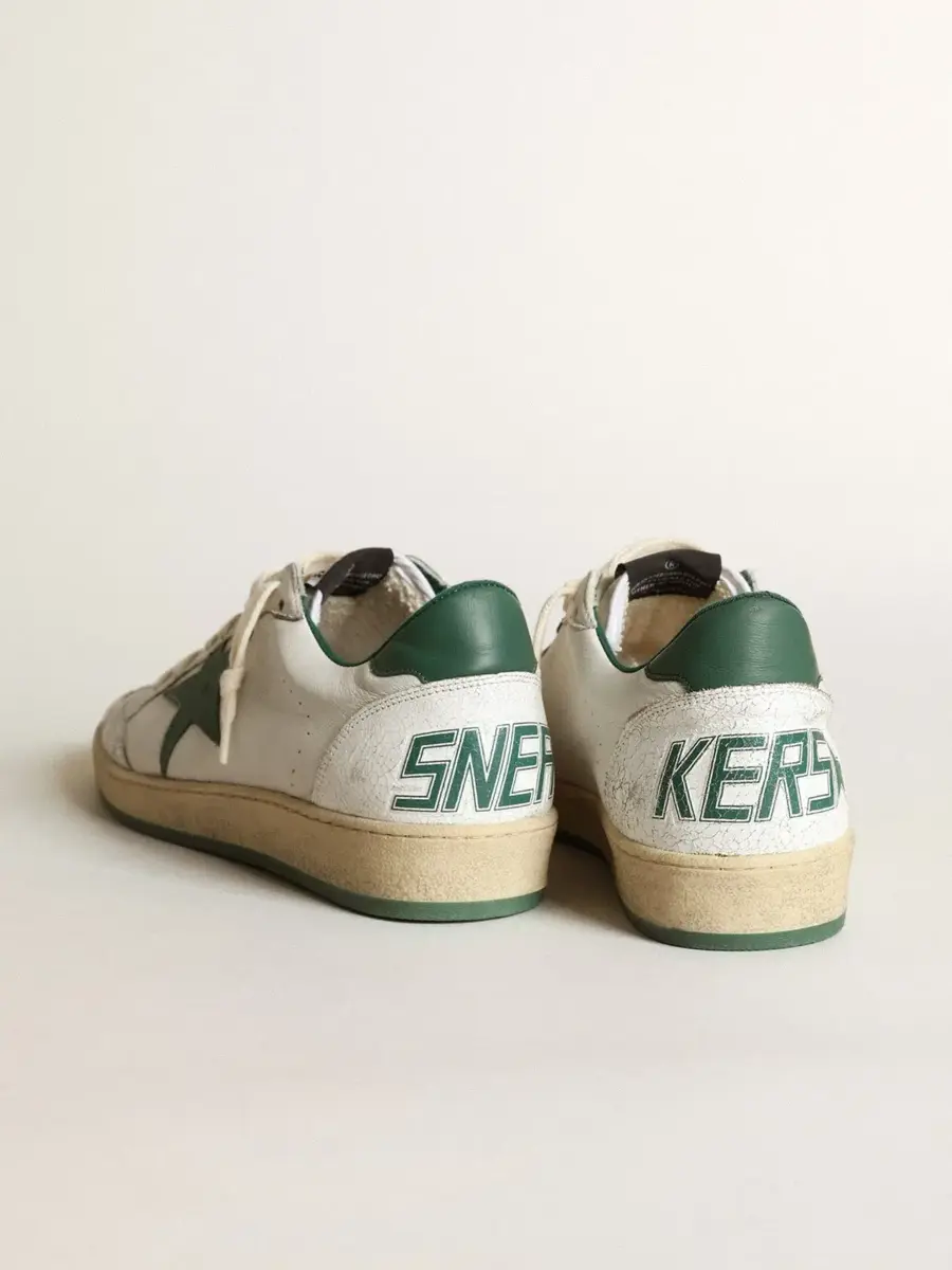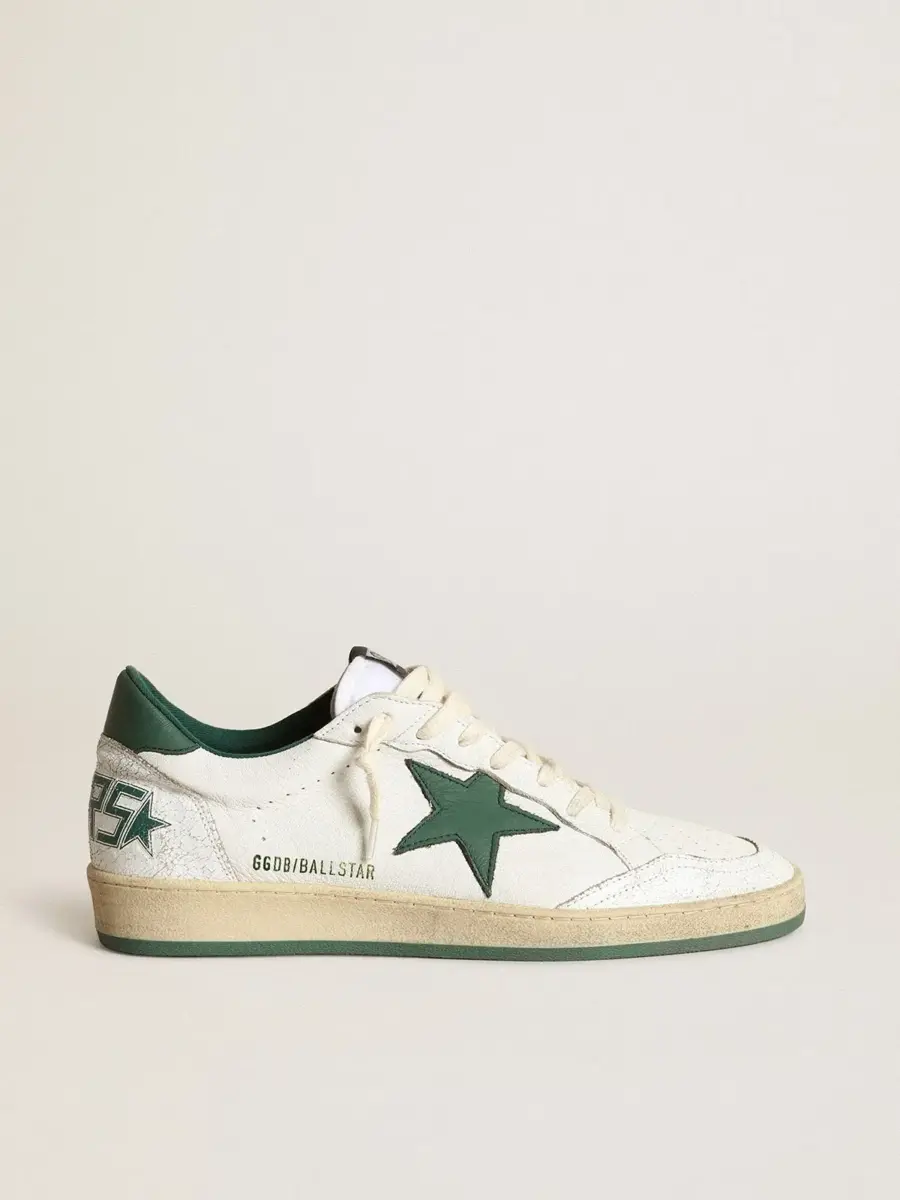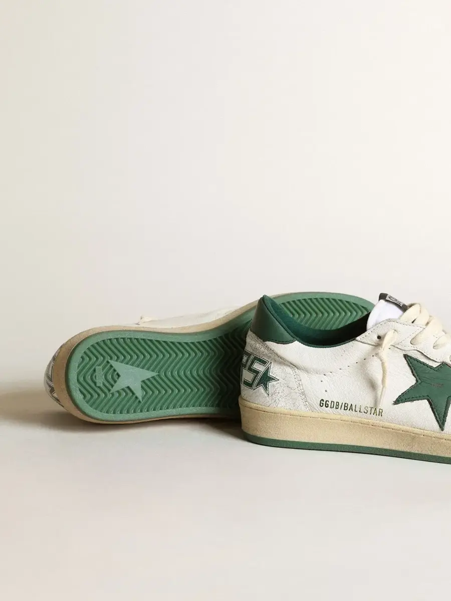 Soñando con los años ochenta. Nuestras zapatillas Ball Star tienen un aire universitario americano, a caballo entre el baloncesto y el skate. Este modelo para mujer, con parte superior de piel napa blanca, presenta una estrella y una lengüeta en el talón de piel verde mate y detalles de piel craquelada blanca, como la puntera y la inserción en la parte trasera. La suela verde y los cordones color crema añaden el toque final: cosas bonitas que nunca pasan de moda.