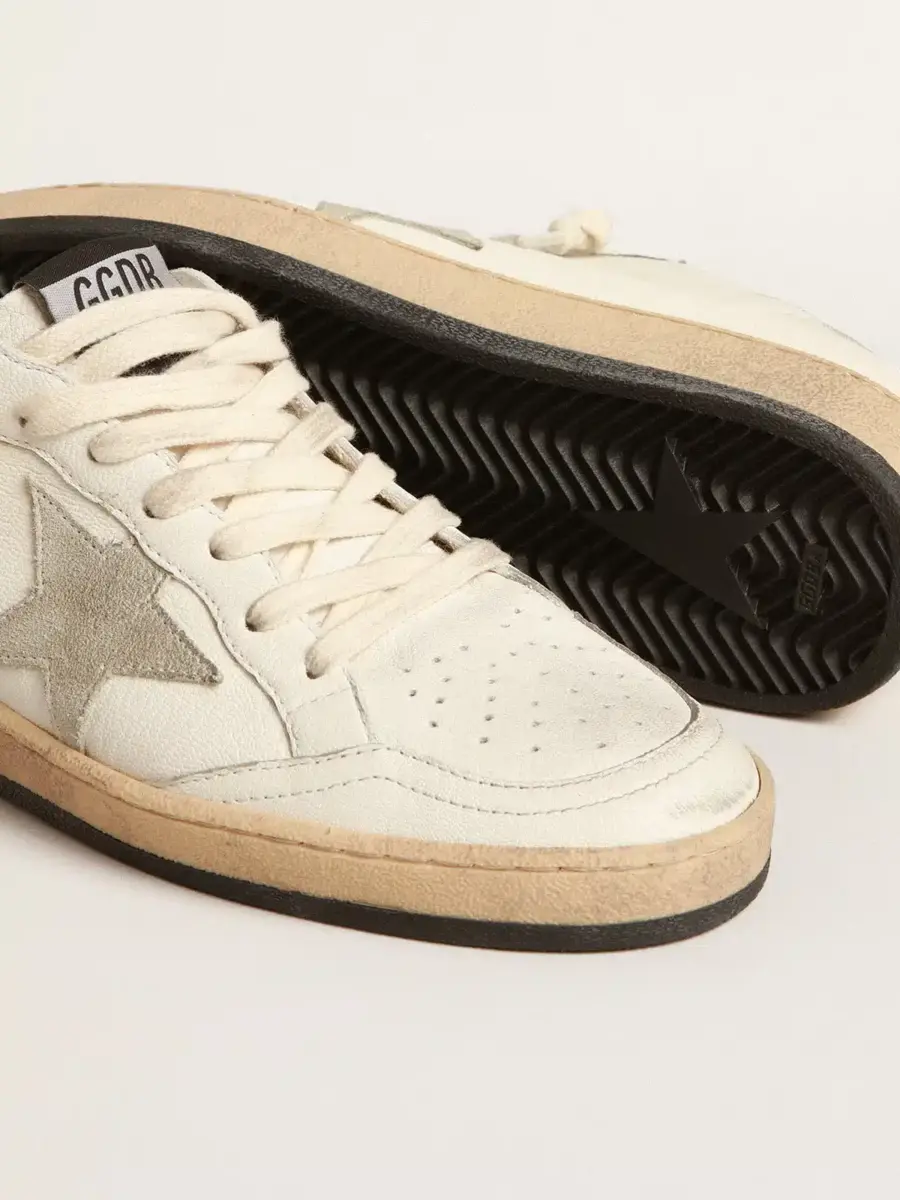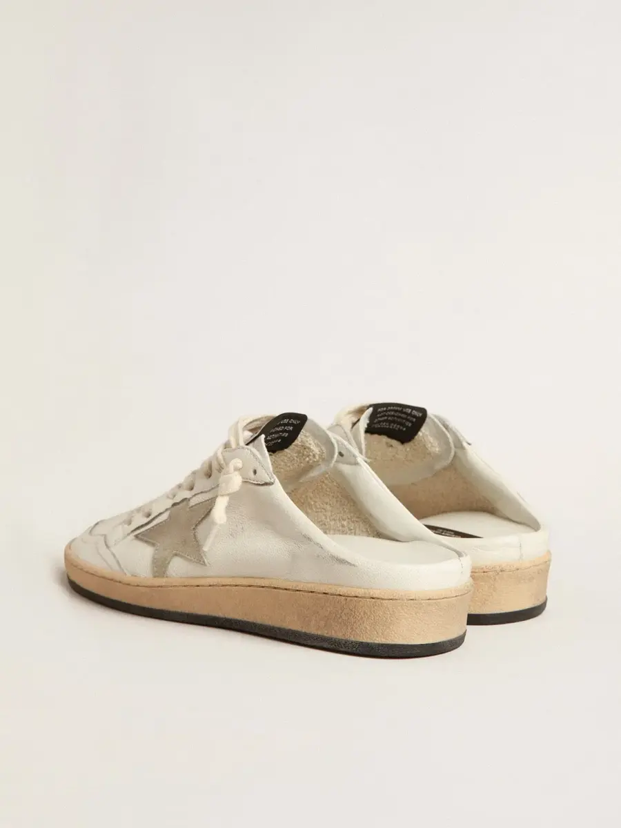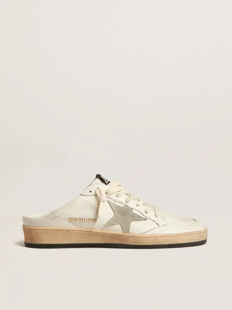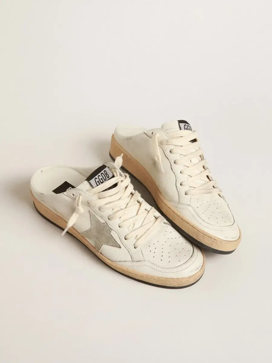 Soñando con los años ochenta. Nuestras zapatillas Ball Star tienen un aire universitario americano, a caballo entre el baloncesto y el skate. La versión sabot de este modelo, con parte superior de piel napa blanca, presenta una estrella de ante gris hielo. La suela negra y los cordones color crema añaden el toque final: cosas bonitas que nunca pasan de moda.