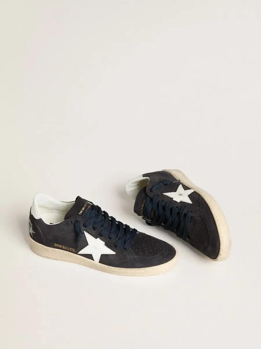 Soñando con los años ochenta. Nuestras zapatillas Ball Star tienen un aire universitario americano, a caballo entre el baloncesto y el skate. Esta versión con parte superior de ante azul oscuro cuenta con una estrella y una lengüeta en el talón de cuero blanco. Y los cordones azul oscuro añaden el toque final: cosas bonitas que nunca pasan de moda.
