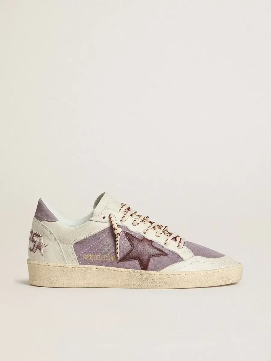 Soñando con los años ochenta. Nuestras zapatillas Ball Star tienen un aire universitario americano, a caballo entre el baloncesto y el skate. Este modelo, con parte superior de ante lila e inserciones de piel blanca, cuenta con una estrella de piel burdeos y una lengüeta de ante lila en el talón. Y los cordones multicolores añaden el toque final: cosas bonitas que nunca pasan de moda.