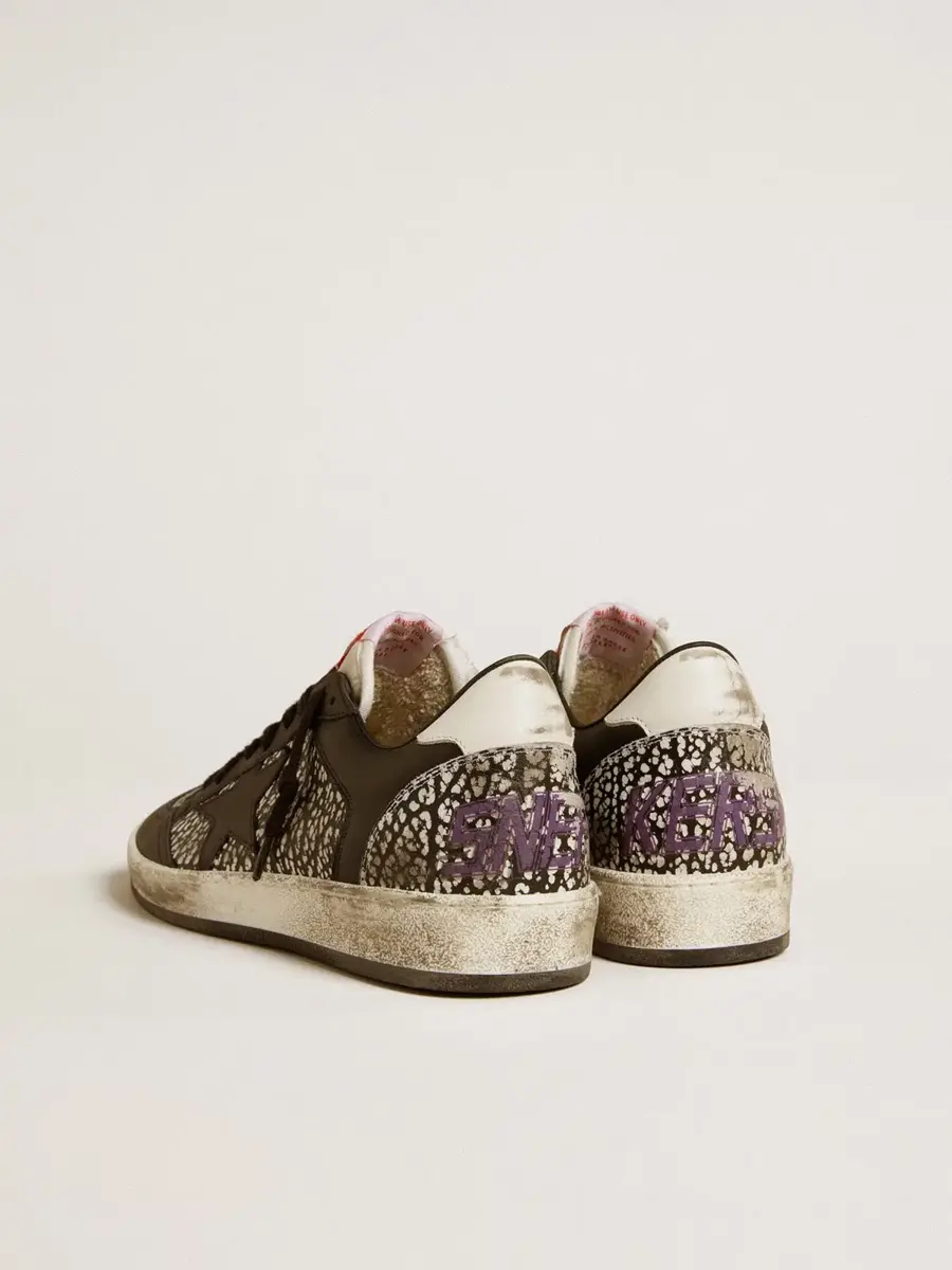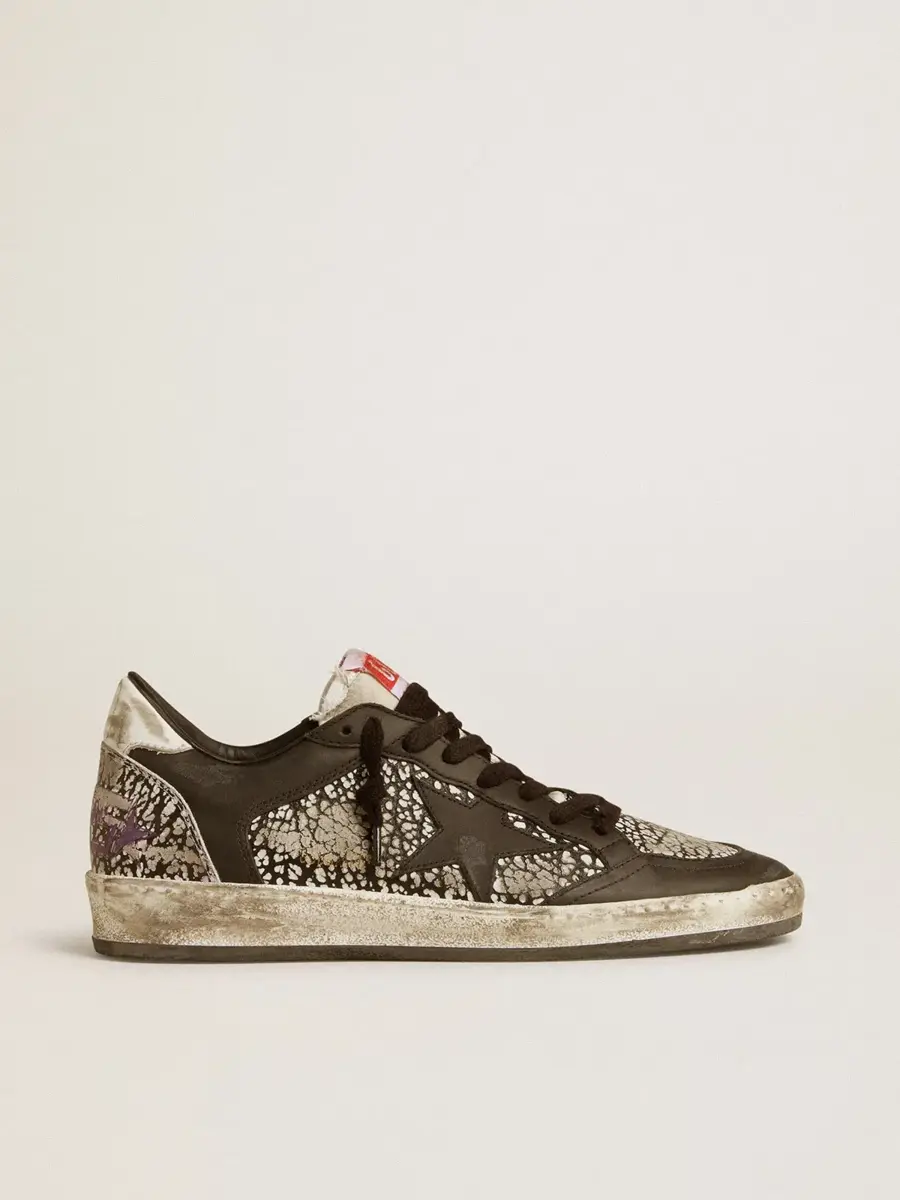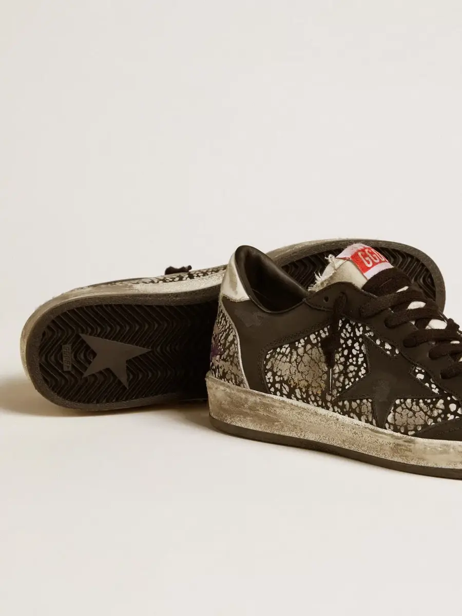 Soñando con los años ochenta. Nuestras zapatillas Ball Star tienen un aire universitario americano, a medio camino entre el baloncesto y el skate. Con una parte superior de piel con estampado de piel de elefante en blanco y negro, este modelo para mujer cuenta con una estrella de piel negra y una lengüeta en el talón de piel blanca. Las inserciones de piel negra y los cordones negros añaden el toque final: cosas bonitas que nunca pasan de moda.