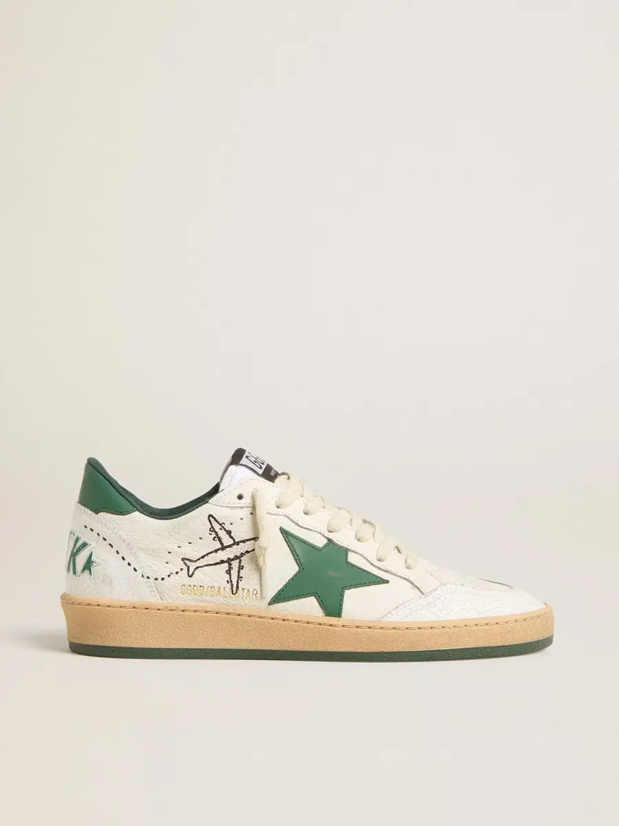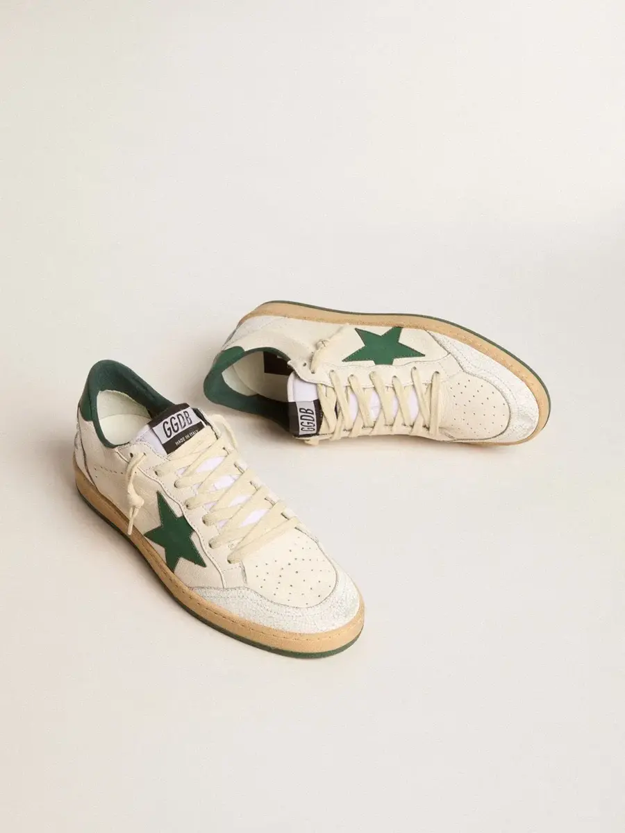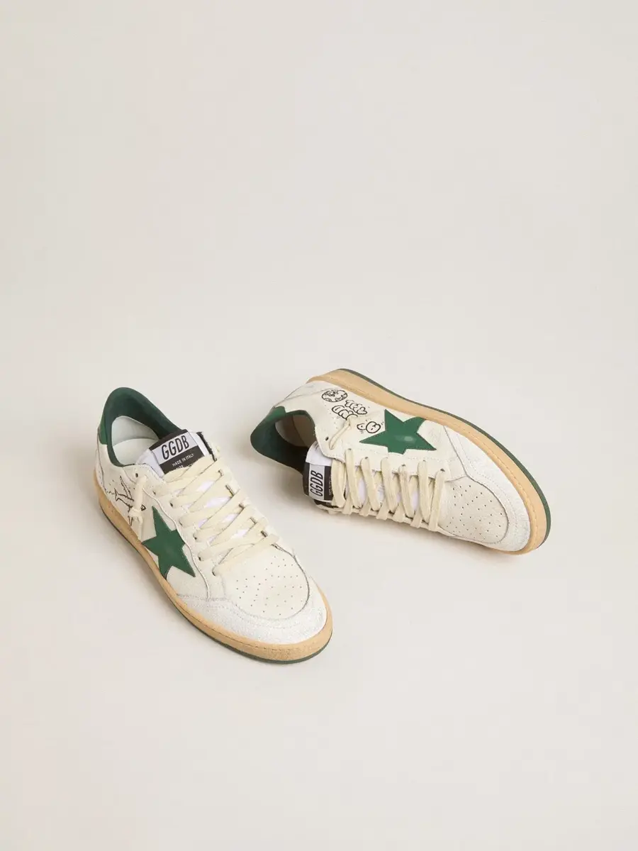 Una zapatilla diseñada para convertir tus momentos especiales en recuerdos inolvidables. Inspirada en el ambiente universitario estadounidense de los años 80, esta Ball Star presenta la inscripción «Good Luck» en verde en el talón. Este modelo para mujer, con una parte superior de piel napa blanca, destaca por su estrella verde y sus detalles de piel craquelada blanca, como la puntera y la inserción en la parte trasera.