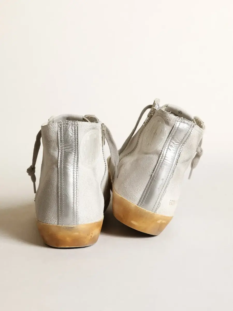 Los años setenta, hoy: inspiradas en el mundo del baloncesto, las zapatillas Francy se actualizan con detalles inesperados y acabados especiales. Este modelo con parte superior de ante blanco presenta una estrella de cuero negro y una lengüeta adornada con microcristales Swarovski plateados. La lengüeta del talón en cuero plateado metalizado y los cordones gris hielo añaden los toques finales.