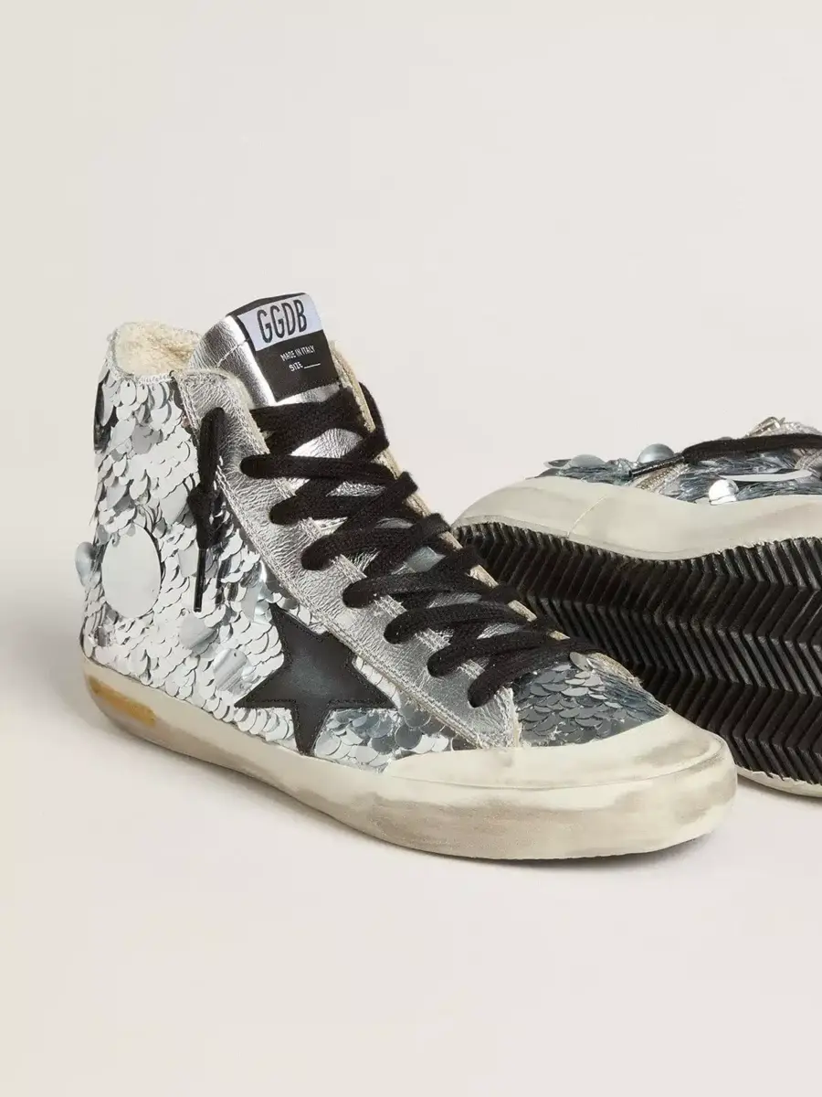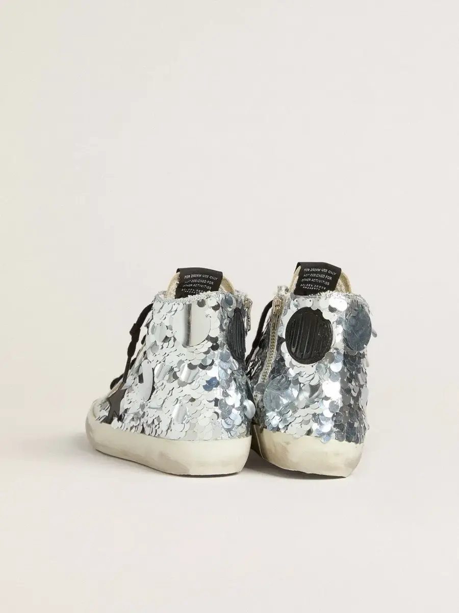 Los años setenta, hoy: inspiradas en el mundo del baloncesto, las zapatillas Francy se actualizan con detalles inesperados y acabados especiales. Estas zapatillas con parte superior de nailon bordada con lentejuelas plateadas cuentan con una estrella de cuero negro. Los cordones negros añaden el toque final.