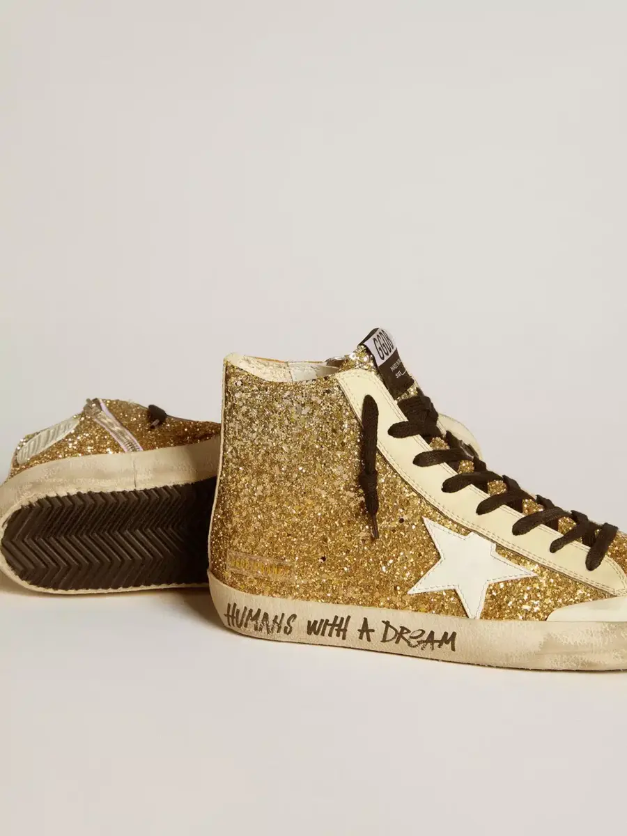 Los años setenta, hoy: inspiradas en el mundo del baloncesto, las zapatillas Francy se actualizan con detalles inesperados y acabados especiales. Estas zapatillas con parte superior dorada brillante cuentan con una estrella de cuero blanco y una lengüeta de cuero marfil en el talón. Las inserciones de cuero marfil y los cordones negros completan el look.