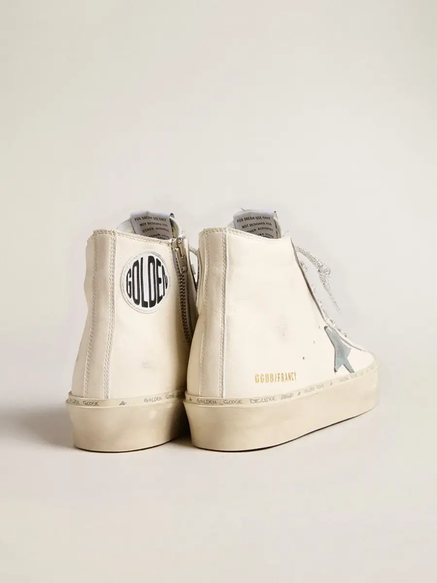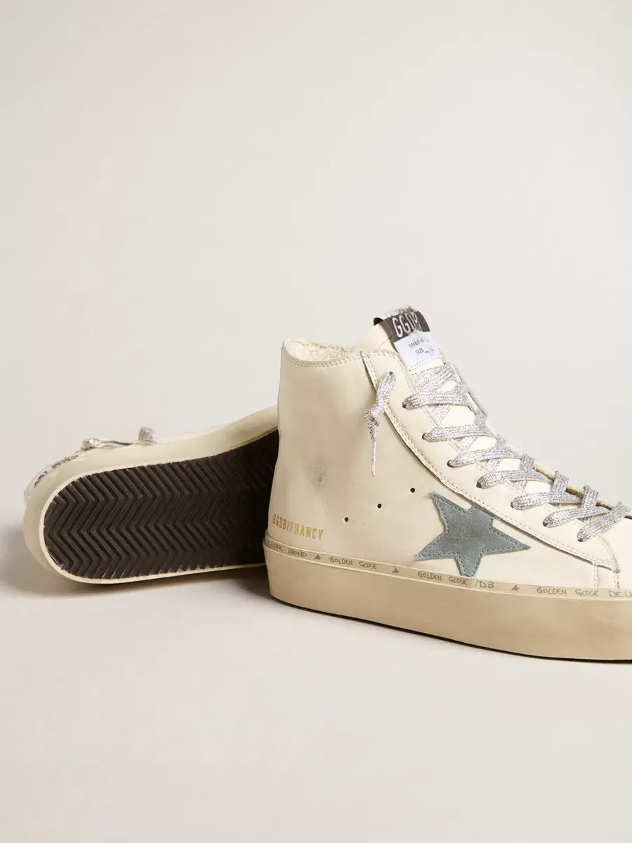 Los años setenta, hoy: inspiradas en el mundo del baloncesto, las zapatillas Francy se actualizan con detalles inesperados y acabados especiales. Estas zapatillas con parte superior de piel napa blanca cuentan con una estrella de ante azul claro y una lengüeta en el talón de piel napa blanca. Las letras plateadas en el ribete y los cordones plateados de Lurex completan el look.