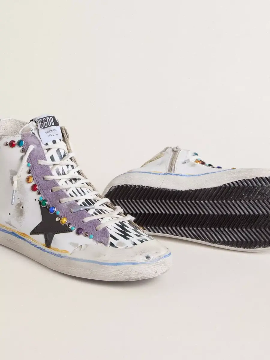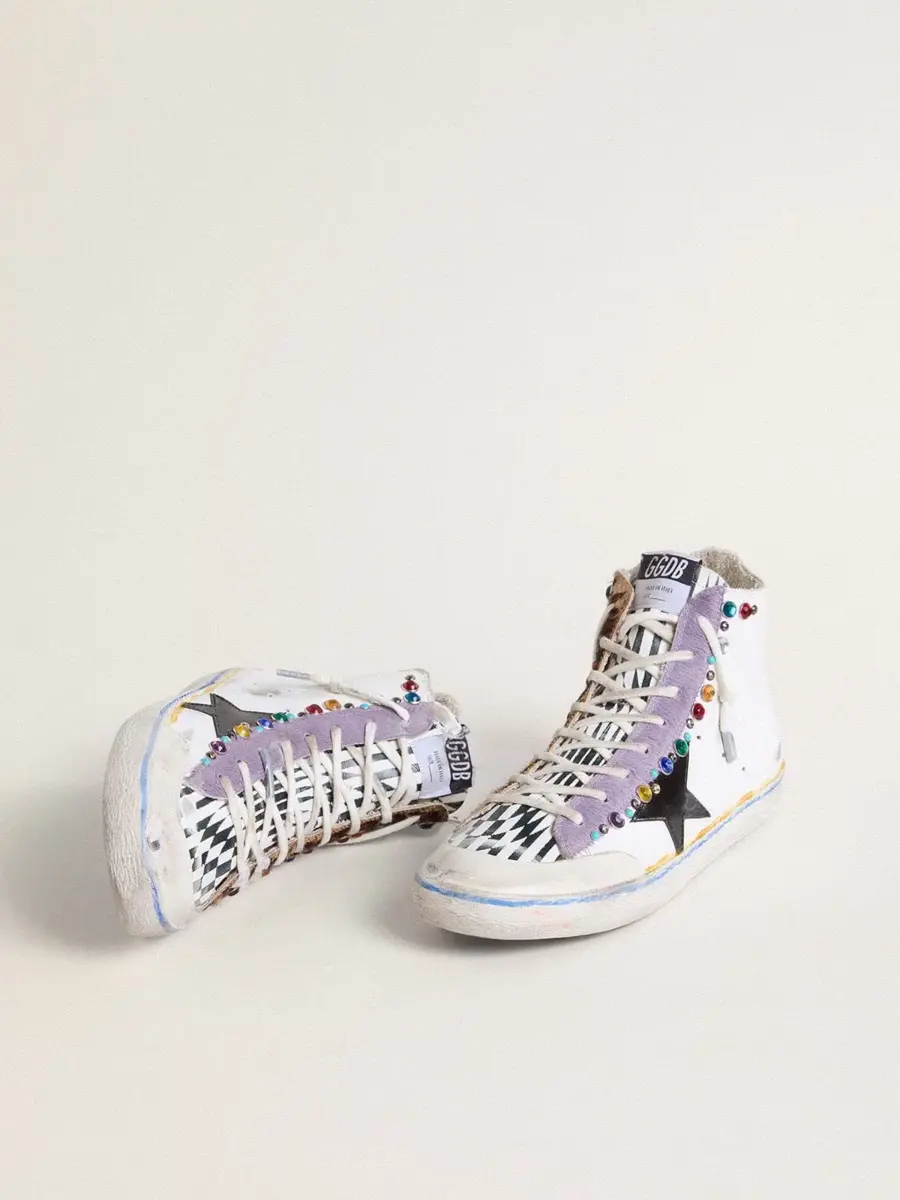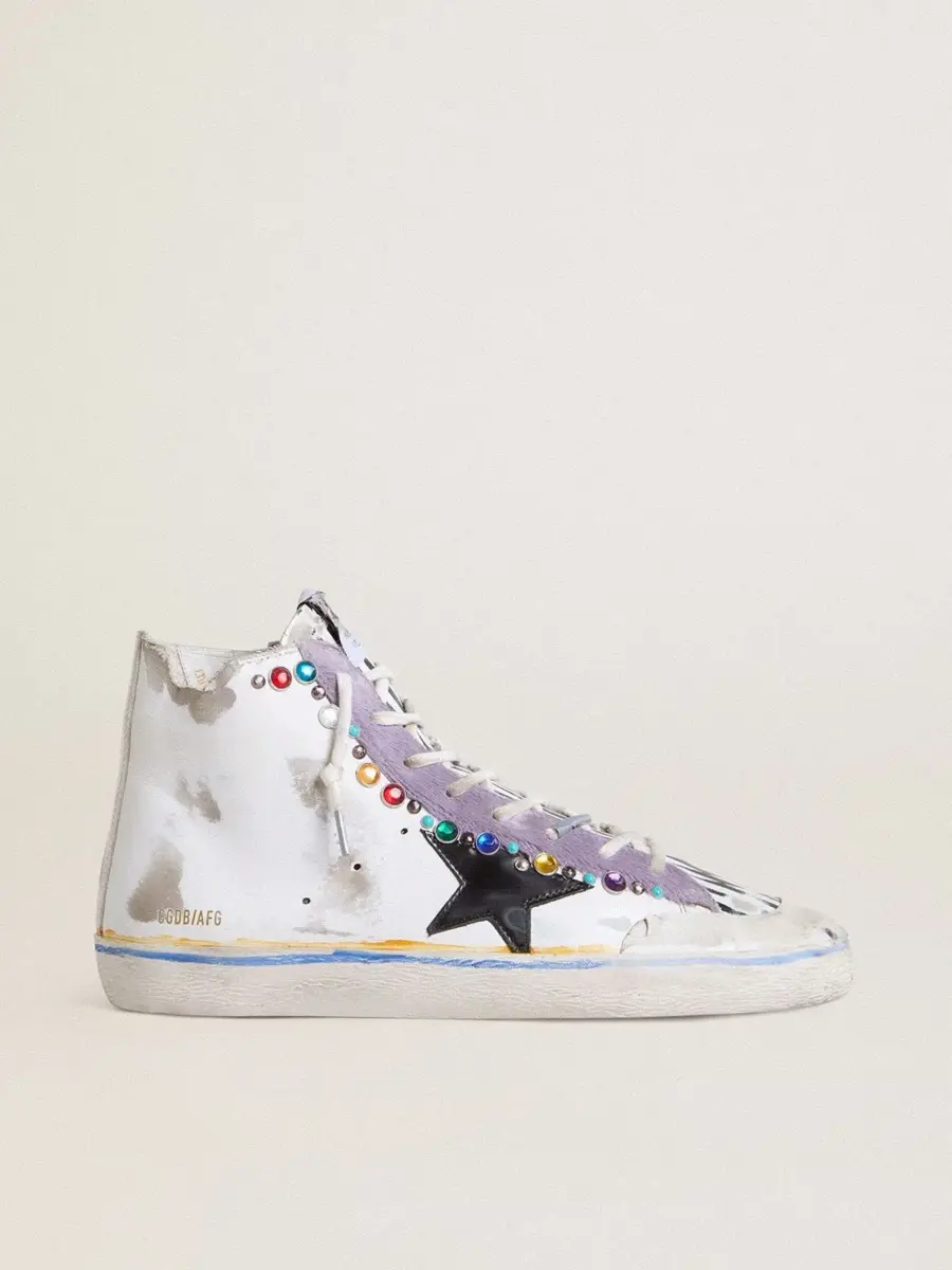 Los años setenta, hoy: inspiradas en el mundo del baloncesto, las zapatillas Francy se actualizan con detalles inesperados y acabados especiales. Con una parte superior de piel blanca con efecto desgastado acentuada por tachuelas multicolores, estas zapatillas LAB para mujer cuentan con una estrella de piel negra brillante y una inserción de piel de potro lila. Una lengüeta de piel blanca con estampado geométrico negro en contraste, puntera de goma blanca, doble raya amarilla y azul en el ribete y cordones blancos completan el look.