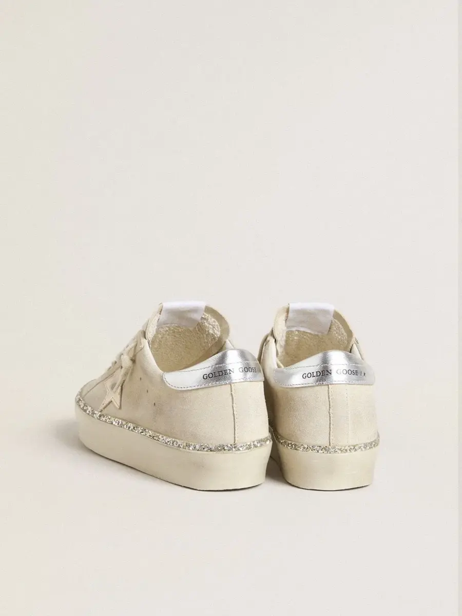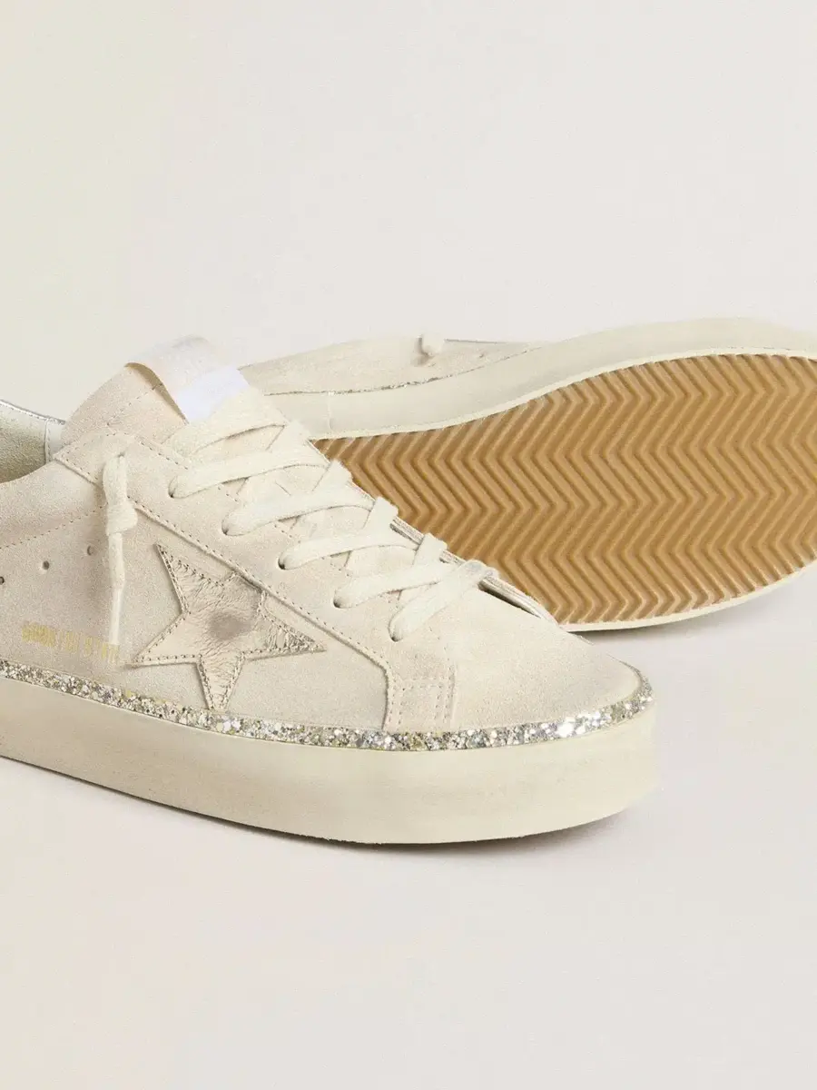 Doble altura y diseño icónico: inspiradas en nuestras zapatillas Super-Star, las zapatillas Hi Star cuentan con doble ribete, adornado con letras escritas a mano. Este modelo en ante color crema cuenta con una estrella y una lengüeta en el talón de cuero metalizado plateado. El doble ribete plateado brillante y los cordones de color crema añaden el toque final.