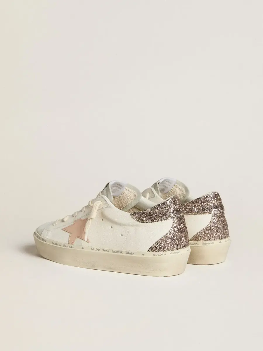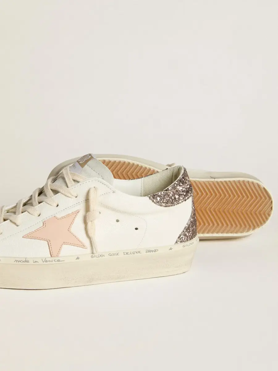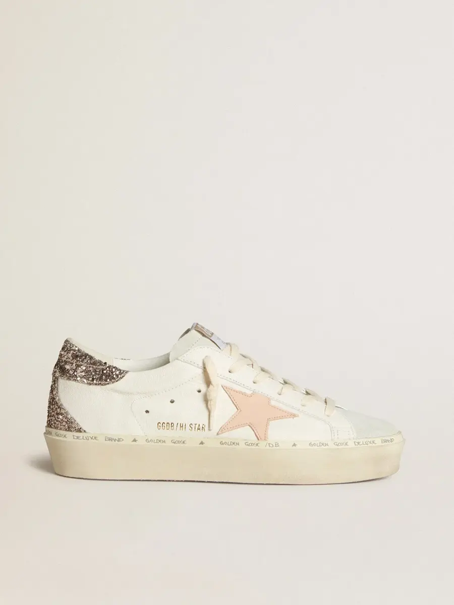 Doble altura y diseño icónico: inspiradas en nuestras zapatillas Super-Star, las zapatillas Hi Star cuentan con doble ribete, adornado con letras escritas a mano. Este modelo de napa blanca cuenta con una estrella de cuero rosa y una lengüeta con purpurina rosa claro en el talón y una inserción en la parte trasera. La lengüeta de ante azul pastel y los cordones de color crema añaden el toque final.