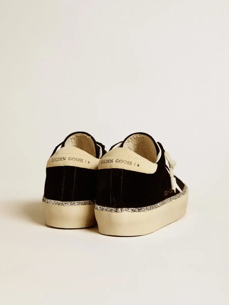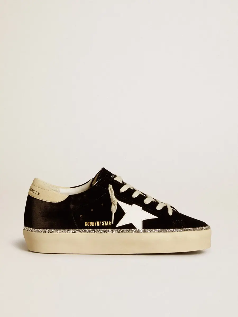 Doble altura y diseño icónico: inspiradas en nuestras zapatillas Super-Star, las zapatillas Hi Star cuentan con doble ribete, adornado con letras escritas a mano. Este modelo de terciopelo negro cuenta con una estrella de cuero blanco y una lengüeta de ante beige claro en el talón. El ribete plateado brillante y los cordones de color crema añaden los toques finales.