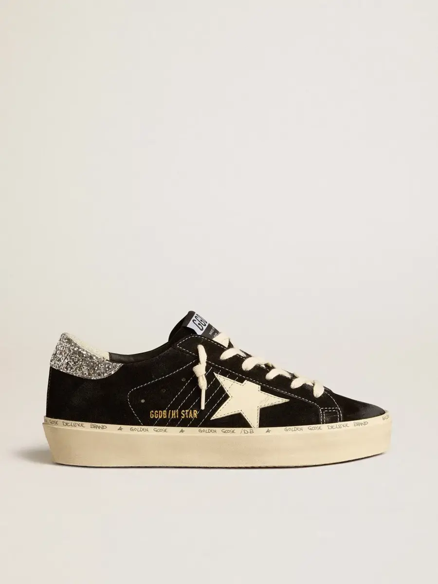 Doble altura y diseño icónico: inspiradas en nuestras zapatillas Super-Star, las zapatillas Hi Star cuentan con doble ribete, adornado con letras escritas a mano. Este modelo de piel negra presenta costuras blancas en la parte superior y una lengüeta plateada brillante en el talón. La estrella y los cordones de color crema añaden el toque final.