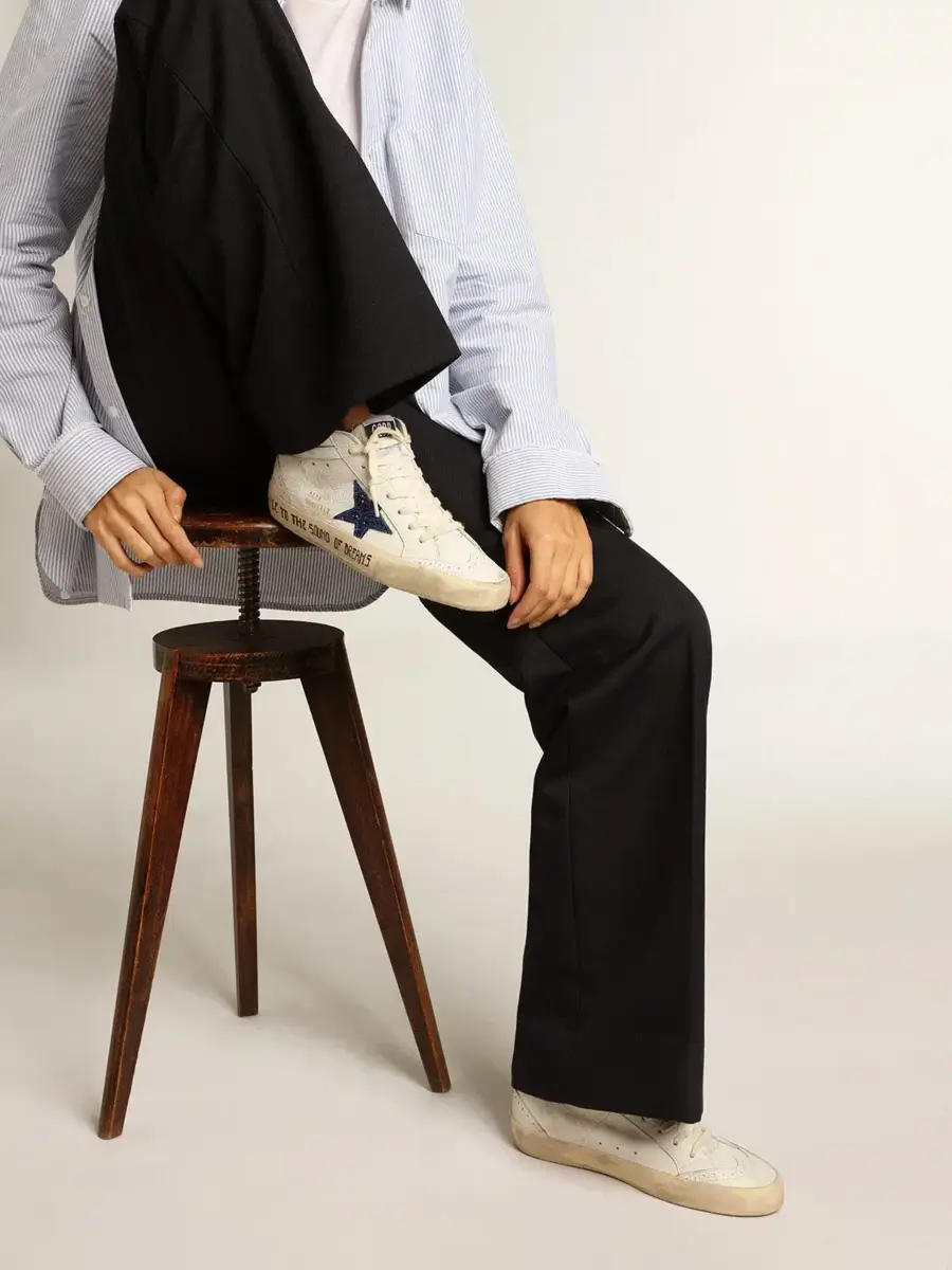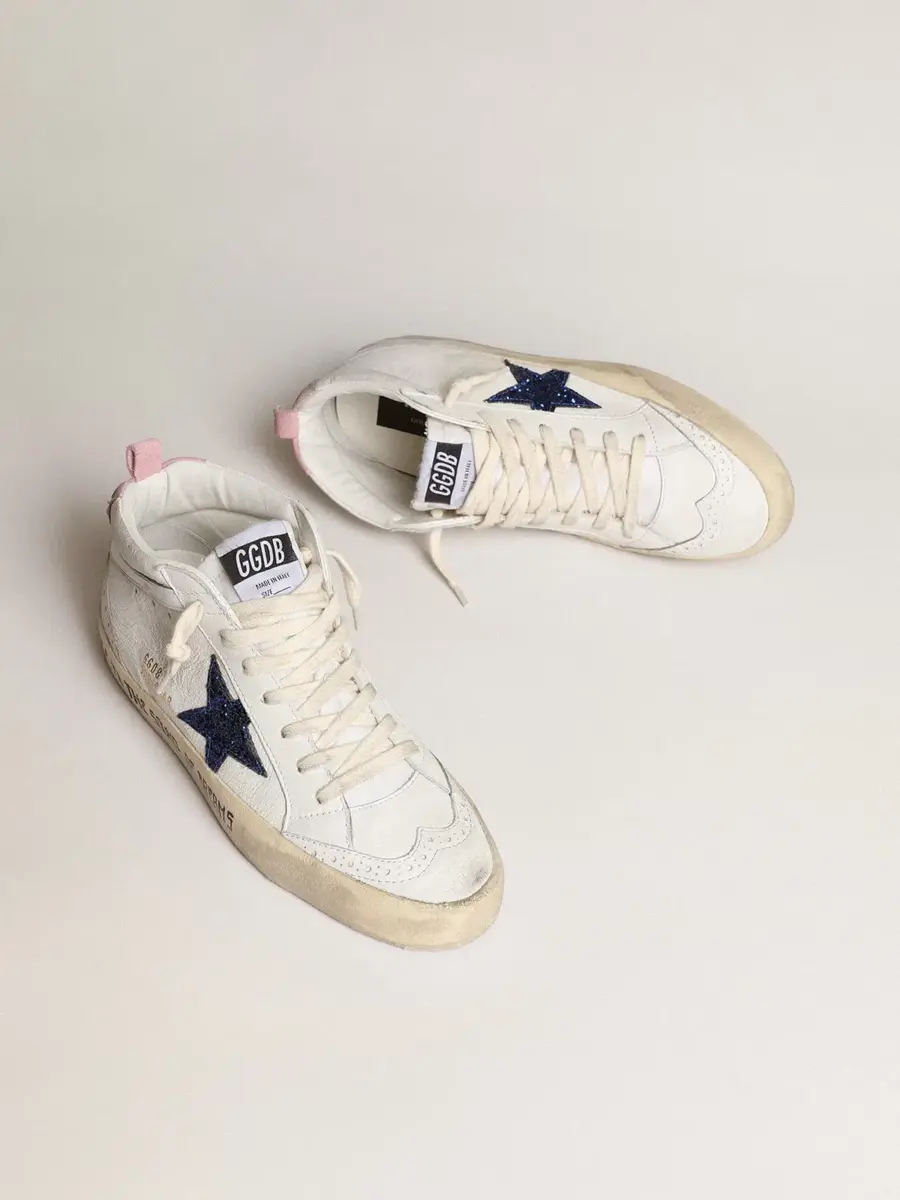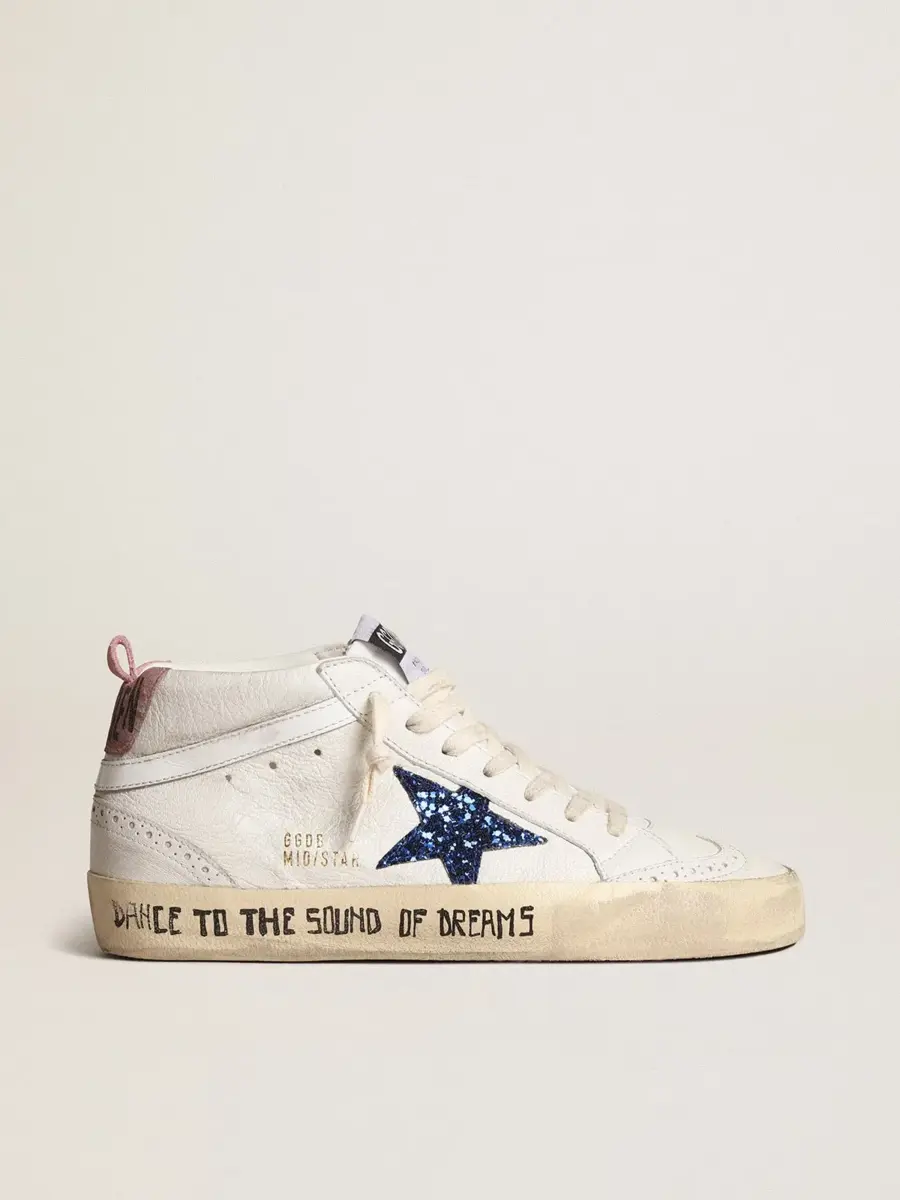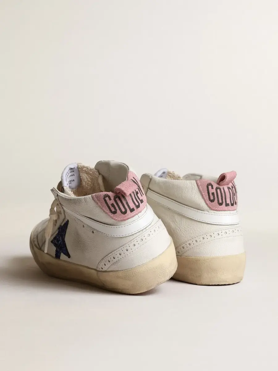 Versatilidad única y elegante: las zapatillas Mid Star adoptan un enfoque refinado de su inspiración en la escena del skate de los años noventa. Este modelo, con una parte superior de piel napa blanca, presenta una estrella azul brillante y un detalle de piel blanca brillante. La lengüeta del talón de ante rosa, las letras negras en contraste en el ribete y los cordones de color crema completan el look.