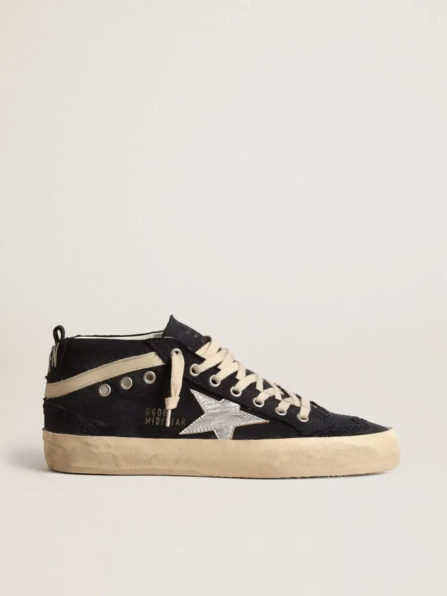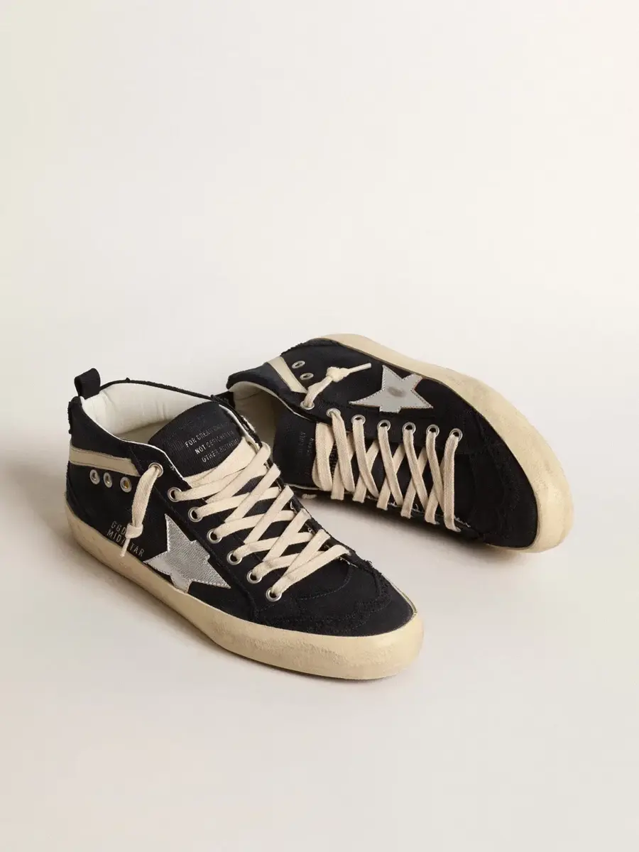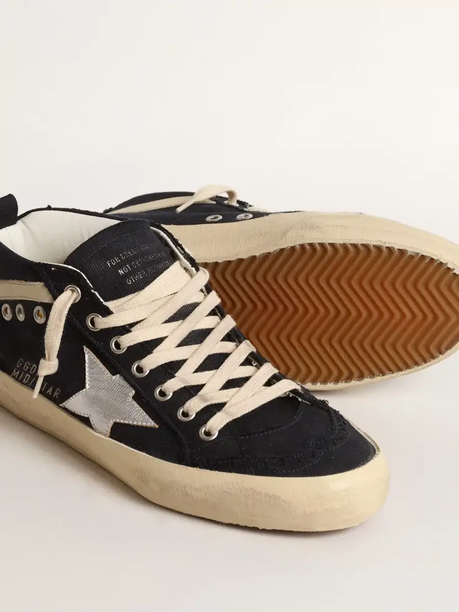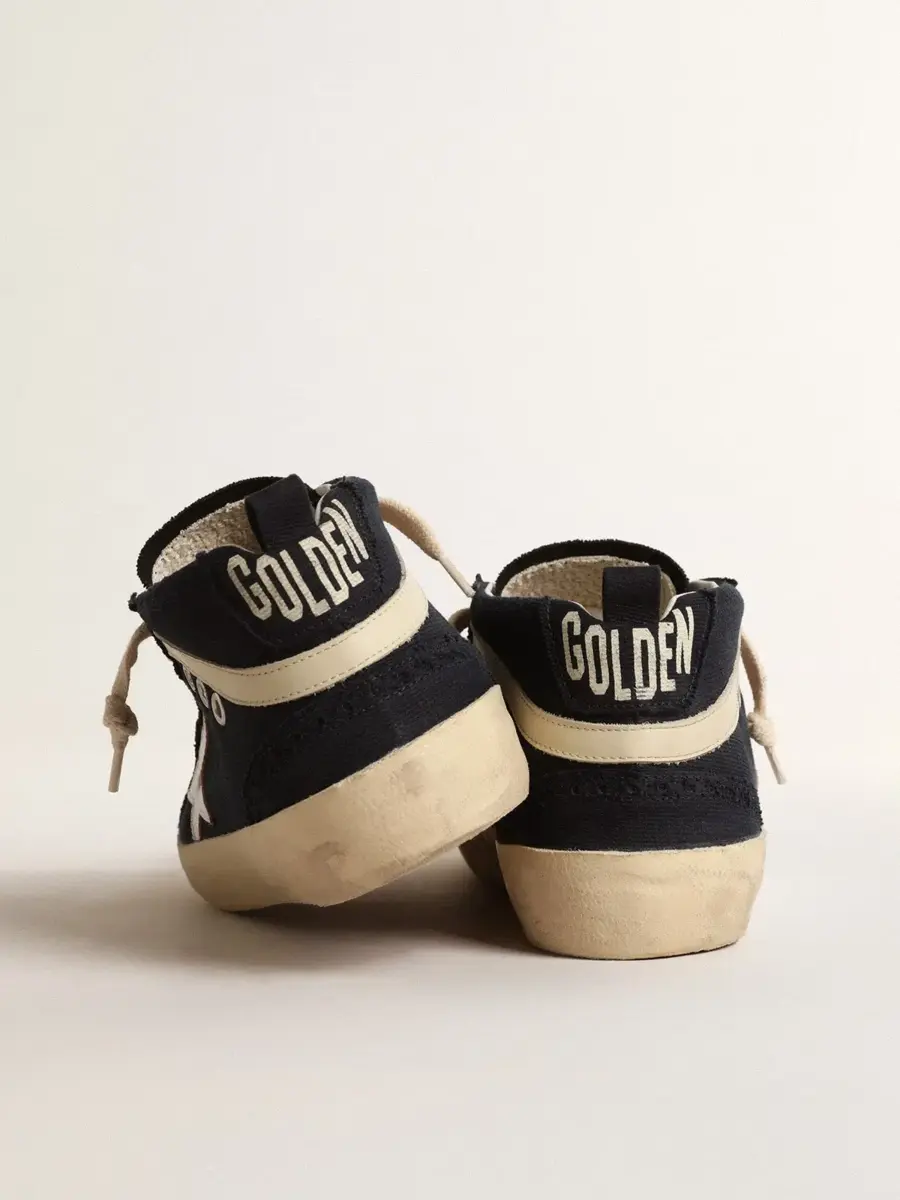 Versatilidad única y elegante: las zapatillas Mid Star aportan un toque refinado a su inspiración en la escena skater de los noventa. Este modelo, con parte superior de algodón azul marino, presenta una estrella de cuero metalizado plateado y un detalle de cuero marfil. La lengüeta del talón de algodón azul marino y los cordones marfil completan el look.