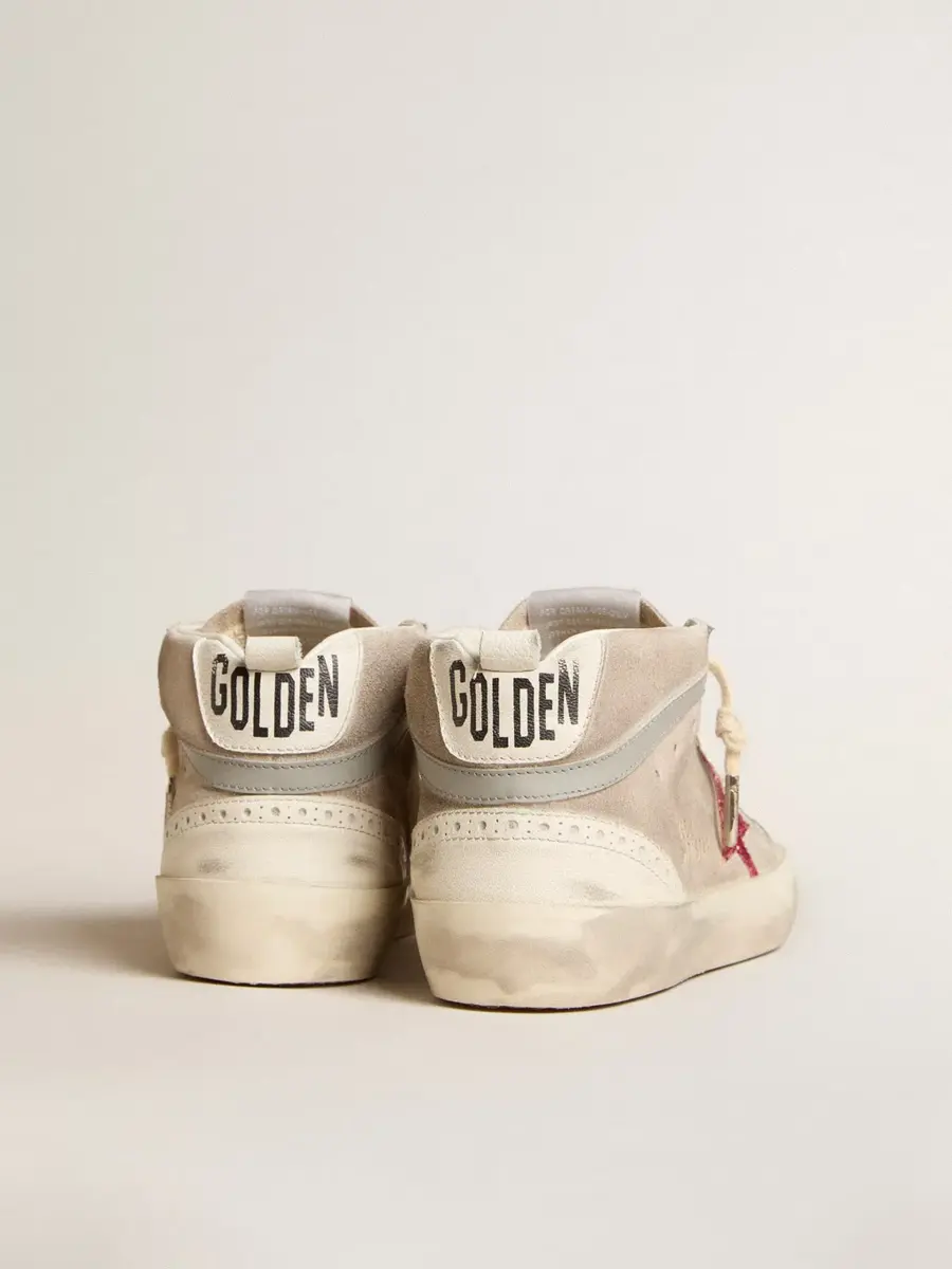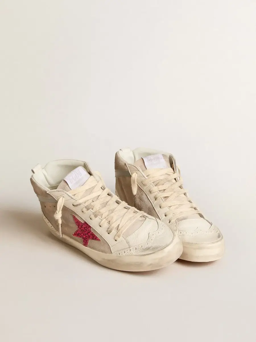 Versatilidad única y elegante: las zapatillas Mid Star aportan un toque refinado a su inspiración en la escena skater de los noventa. Este modelo, con parte superior de ante gris paloma, presenta una estrella brillante fucsia y un detalle de cuero gris. La lengüeta del talón de cuero blanco, los insertos de napa blanca y los cordones blancos completan el look. Item No. GWF00122.F005975.11877 GWF00122.F005975.11877