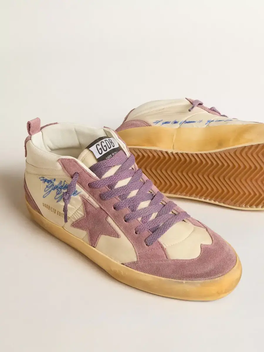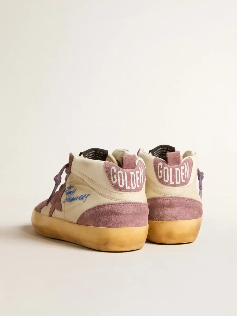 Versatilidad y elegancia únicas: las zapatillas Mid Star aportan un toque refinado a su inspiración en la escena skater de los noventa. Este modelo para mujer, con parte superior de nylon blanco y piel napa, presenta una estrella de ante malva y un detalle de algodón blanco. La lengüeta y las inserciones de ante malva en el talón, la firma Golden Goose en la parte superior y los cordones lila completan el look.